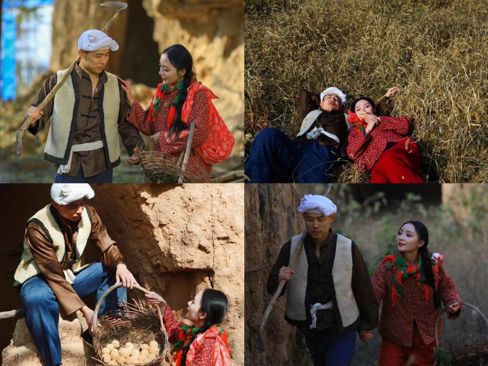 此外,同学们还拍摄了电视剧中九儿、阿宝等经典形象。在镜头前,他们或温婉、或坚韧、或豪放,将角色的性格特点展现得淋漓尽致。阿宝扛着锄头九儿拿着簸箕一起去劳作时,大家在拍摄过程中都能感受到他们的幸福和甜蜜。底层人民都是在劳动中寻找快乐,可以看出即使生活条件不好,阿宝和九儿也可以寻找很多快乐时光。