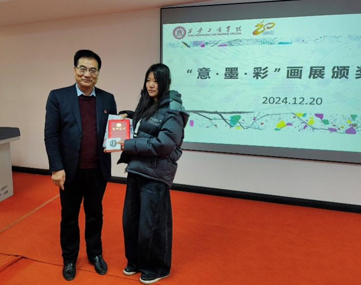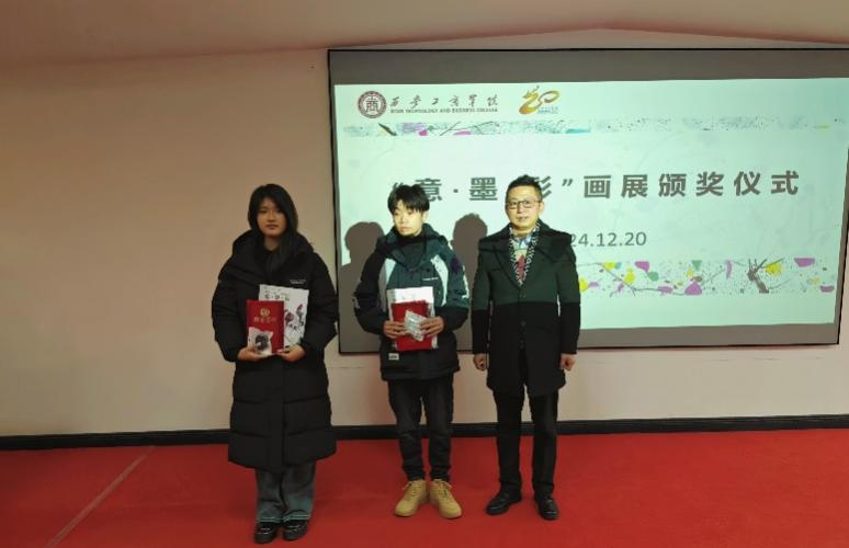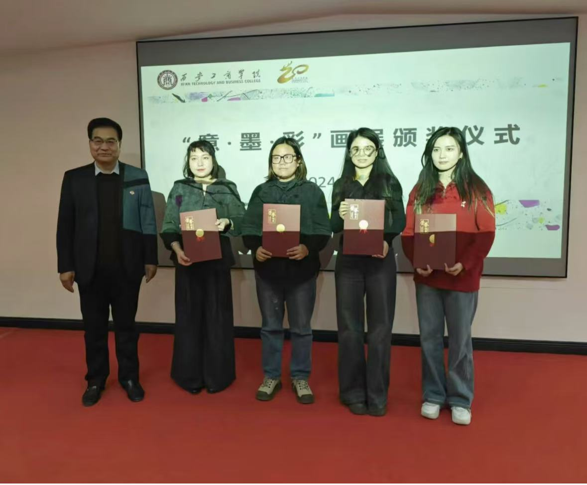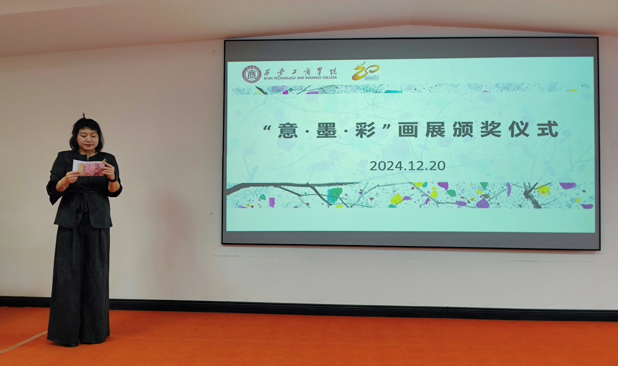 12月20日下午,西安工商学院人文学院广告设计系在图书馆5楼举行了“意、墨、彩”画展颁奖仪式。艺术与传媒学院院长陈敏直、人文学院党总支副书记、副院长原朝阳、广告设计系主任罗曼,以及人文学院教师张素霞、薛舒文、胡嘉怡出席了本次活动。