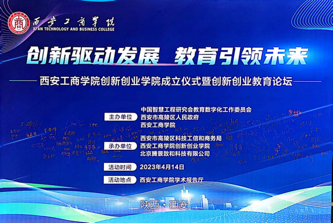 2023年4月14日-15日,西安工商学院成功举办了创新创业学院成立揭牌仪式暨创新创业教育论坛活动,论坛活动主要采取主题报告和深入企业研学相结合的形式进行。整个活动由中国智慧工程研究会教育数字化工作委员会、西安市高陵区人民政府、西安工商学院联合主办,西安市高陵区科技工信和商务局、西安工商学院创新创业学院与北京腾景致和科技有限公司协作承办。中国智慧工程研究会教育数字化工作委员会主任盛鸿宇,国家职业教育指导咨询委员会委员、北京师范大学教授赵志群,陕西省科技资源统筹中心金融部副部长谢飞,西安市科技局高新处副处长龚杰,西安市高陵区政协副主席、区政府党组成员、泾河工业园党工委书记、管委会主任谭胜利,高陵区科技工信商务局局长冯鹏华,西安交通大学、西安外事学院、西京学院等兄弟院校领导,西安得安信息技术有限公司、北京知链科技有限公司、西安集美生态农业有限公司、陕西葫芦大观园文化创意产业有限公司等十余家合作企业领导,共三十余位嘉宾莅临现场,学校校长叶曲炜、副校长程波、各职能部门和二级学院负责人,双创实验班学生、部分师生代表、校友代表参加了本次活动。