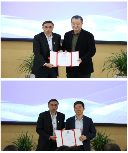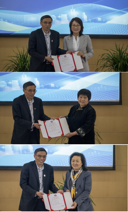 创新创业学院伍建文院长宣读了学校聘任盛鸿宇等8位专家为我校客座教授和创业导师的文件,叶曲炜校长现场为他们颁发了聘书。