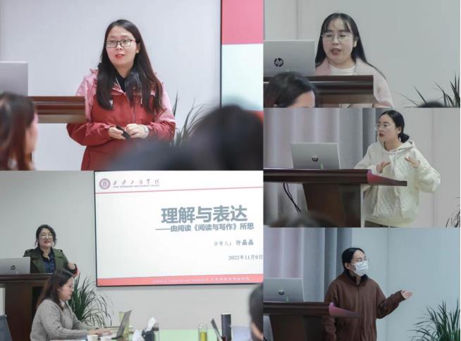 汉语言文学教研室主任张艳艳从什么是‘大写作’以及此书对《应用写作与技能规范》课程授课的启示两方面进行了分享,提出应用写作应融入到热气腾腾的烟火生活之中,加强学生应用写作实践方面的训练。教师王婷针对语言学课程从学生和教师两个角度出发,提出学生应坚持课前预习、课中做笔记的学习方法,教师应遵循“问题不过夜”和“问题不过堂”的授课原则。教师郭丹阳以“理解他人,表达自己”为题,从内、外两个角度分享了自己对文本的细读与思考以及教育中的“裂痕”。教师许晶晶结合自身的教学经历和体会,以理论课为切入点、以“理解与表达”为中心,探讨了有关文艺理论课的教学方法以及如何正确理解、应用文艺理论。教师焦子诺结合具体的教学案例分享了《古代汉语》课程中的阅读与写作教学,指出古代汉语授课时可参考的着眼点、文言文的阅读方法及其对写作的启示。