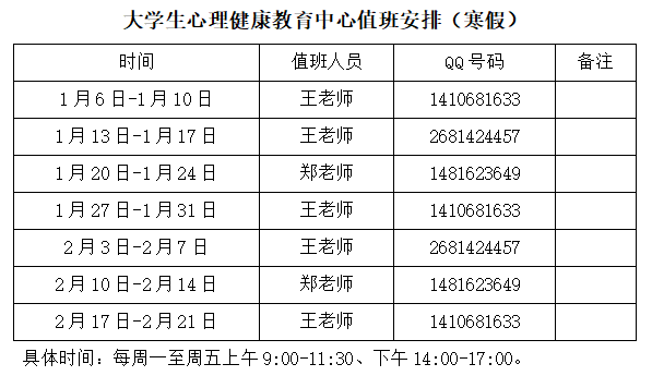 为做好寒假期间学生的心理疏导工作,帮助学生理性应对假期生活,维护我校学生的心理健康,大学生心理健康教育中心在寒假期间继续为全校学生提供线上心理援助服务。具体安排如下: