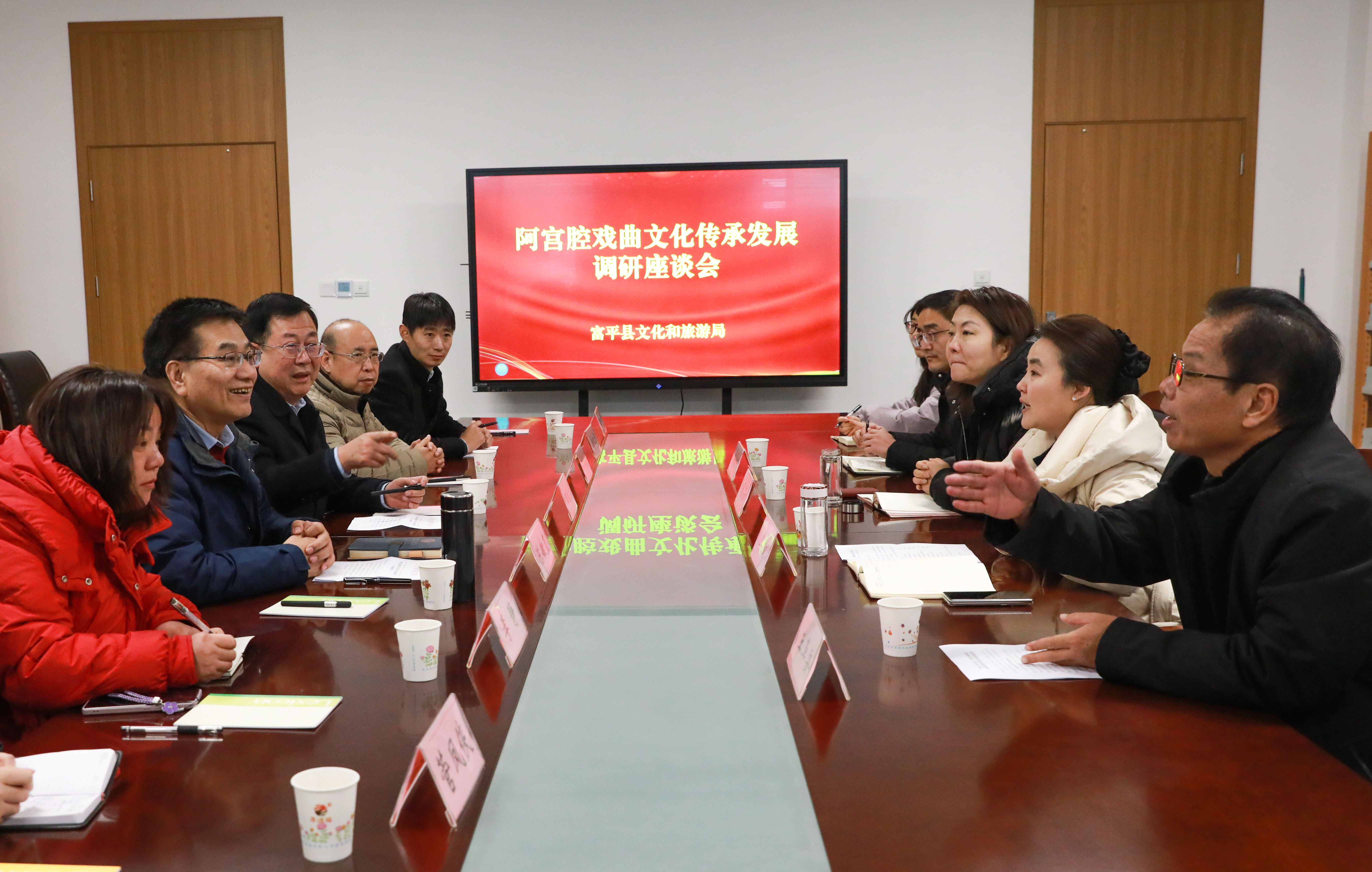 参观结束后,一行人来到富平县文化和旅游局,召开了阿宫腔戏曲文化传承发展调研座谈会。富平县常委、副县长贾丹,富平县文旅局副局长燕宏艺、阿宫腔剧团团长王革委出席座谈会,座谈会由富平县文旅局局长李敏主持。