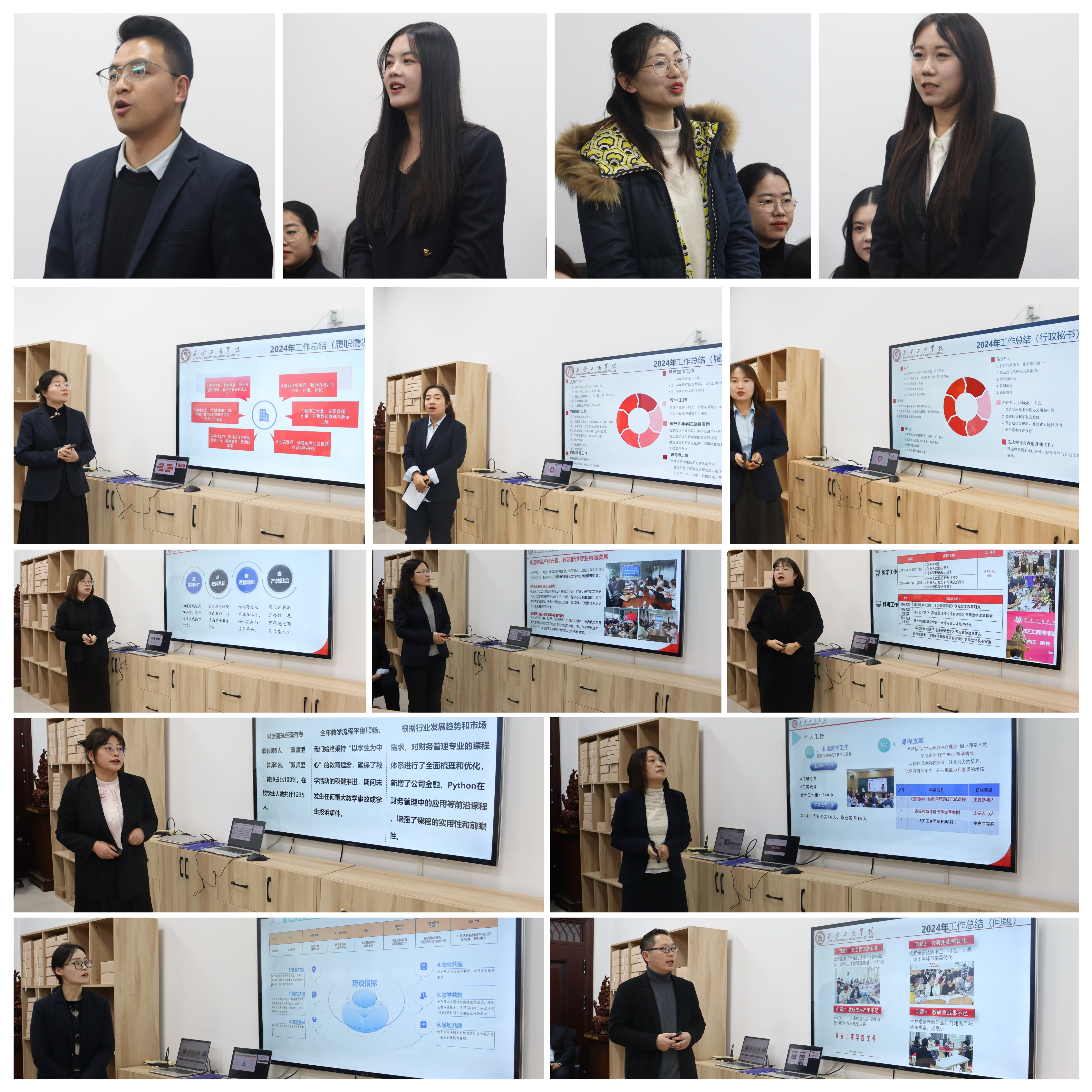 会议第四项,学院各系、教研室、实践中心依次展开汇报,充分彰显了学院各教学科研团队的专业风采与团队精神。数字造价管理系主任王桃桃分享了加入数字鲁班产业学院后开展的一系列“走出去、请进来”教学活动,为工程造价专业内涵建设、课程质量建设,以及双师型师资的培养提供了有效支撑。经济系主任吴亚芳重点围绕新申报的跨境电子商务专业展开汇报,依据新文科建设要求、本科专业类国家教学质量标准等指导意见,优化课程体系,强化实践应用导向,致力于培养适应市场需求的跨境电商人才。其余5位主任分别以总结与展望为核心,依次进行汇报。各系以培养数字经济领域的新商科人才为目标,精准对接AI时代产业需求,全面持续优化应用型课程体系改革,在专业内涵建设、课程质量建设、师资培养、学科竞赛组织、产教融合等方面均展示了各自的特色与亮点。