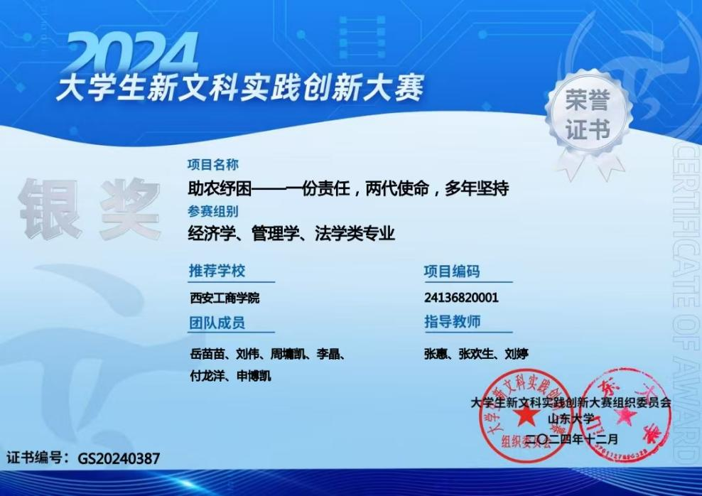 其中,《助农纾困——一份责任,两代使命,多年坚持》项目荣获银奖。该项目在张惠、张欢生、刘婷三位指导老师的悉心指导下,由人文学院汉语言文学专业学生岳苗苗作为项目负责人,与刘伟、周墉凯、李晶、付龙洋、申博凯共同完成。该项目致力于助农纾困,体现了团队成员深厚的社会责任感。项目通过两代人的共同努力和多年坚持,深入探索和实践了助农的新模式和新路径。在项目过程中,团队成员不仅关注农业生产的实际问题,还积极引入先进的管理理念和技术手段,为农业发展提供了有力的支持和帮助。