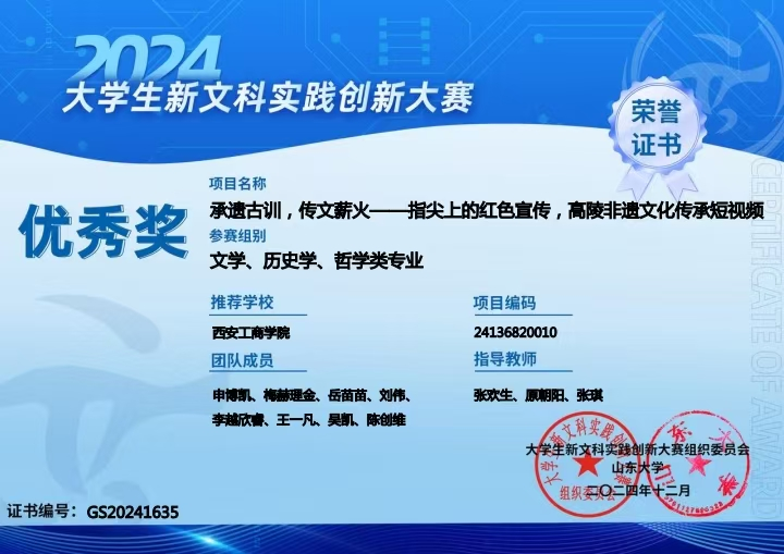 同时,《承遗古训,传文薪火——指尖上的红色宣传,高陵非遗文化传承短视频》项目也荣获优秀奖。该项目在 张欢生、原朝阳、张琪三位老师的指导下,由人文学院网络与新媒体专业学生申博凯作为项目负责人,与梅赫理金、岳苗苗、刘伟、李越欣睿、王一凡、吴凯、陈创维同学携手打造。高陵非遗文化源远流长,蕴含着丰富的历史记忆和地方特色,是先辈们留下的宝贵财富。然而,随着时代变迁,这些珍贵的文化遗产正面临着传承困境。该项目聚焦于此,它以短视频为媒介,让古老的非遗文化在新时代的舞台上绽放光彩,让红色文化在传承中深入人心,为推动文化繁荣发展贡献青春力量。