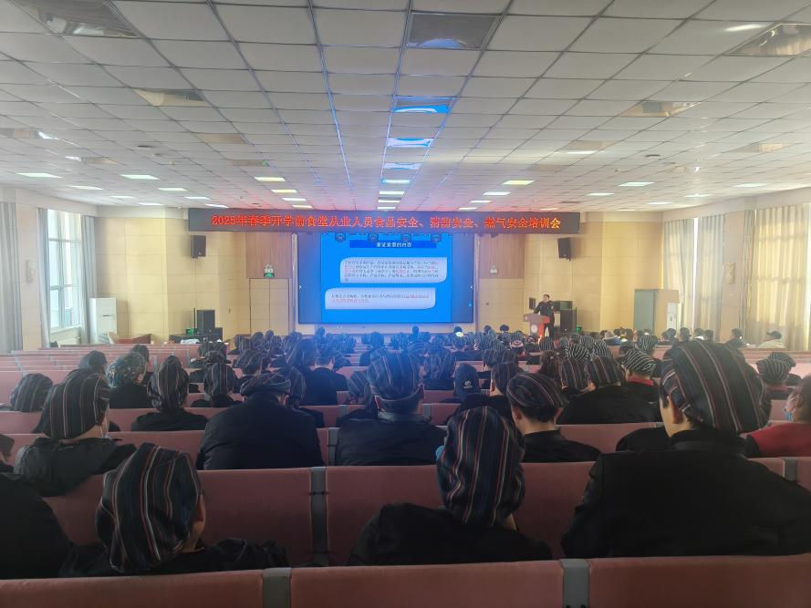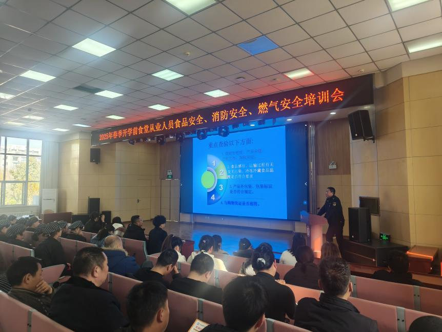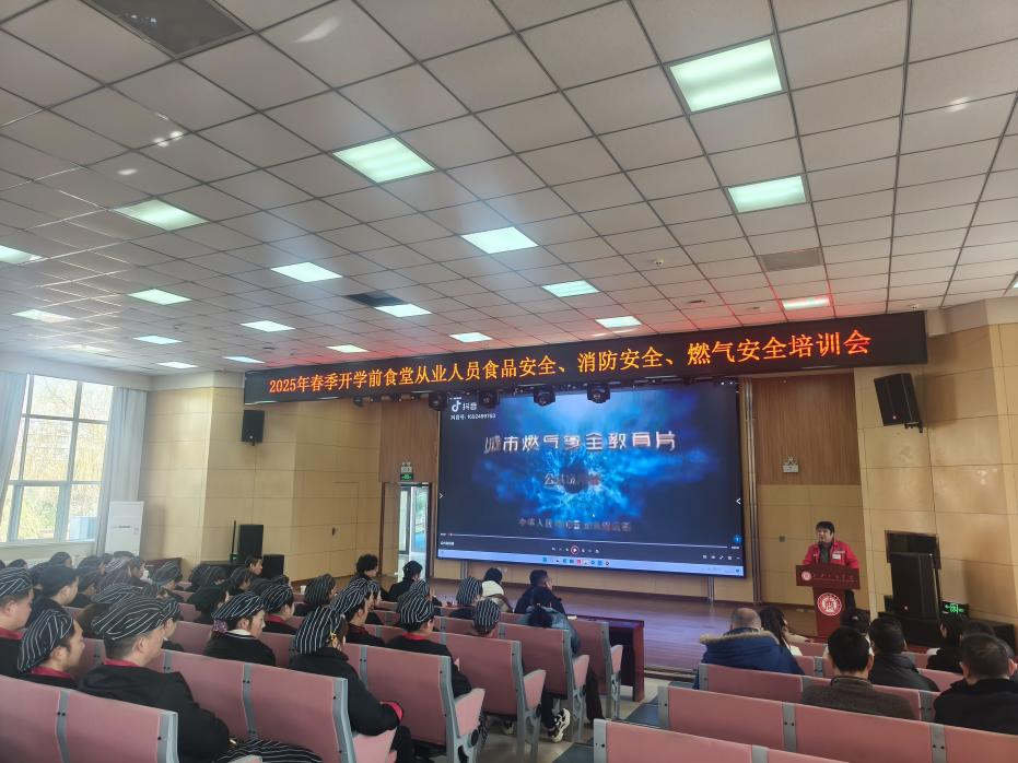 筑牢安全防线 护航开学“第一餐”。2月17日下午,后勤保卫处邀请高陵区市场监管局城区监管所任所长和杨所长,食品科杜科长和党科长、高陵区消防救援大队刘工程师、玉祥天然气公司相经理一行五人,在我校学术报告厅开展食堂从业人员进行了食品、消防、燃气安全知识培训。各餐厅经理、食堂从业人员及后勤保卫处相关工作人员参加培训。