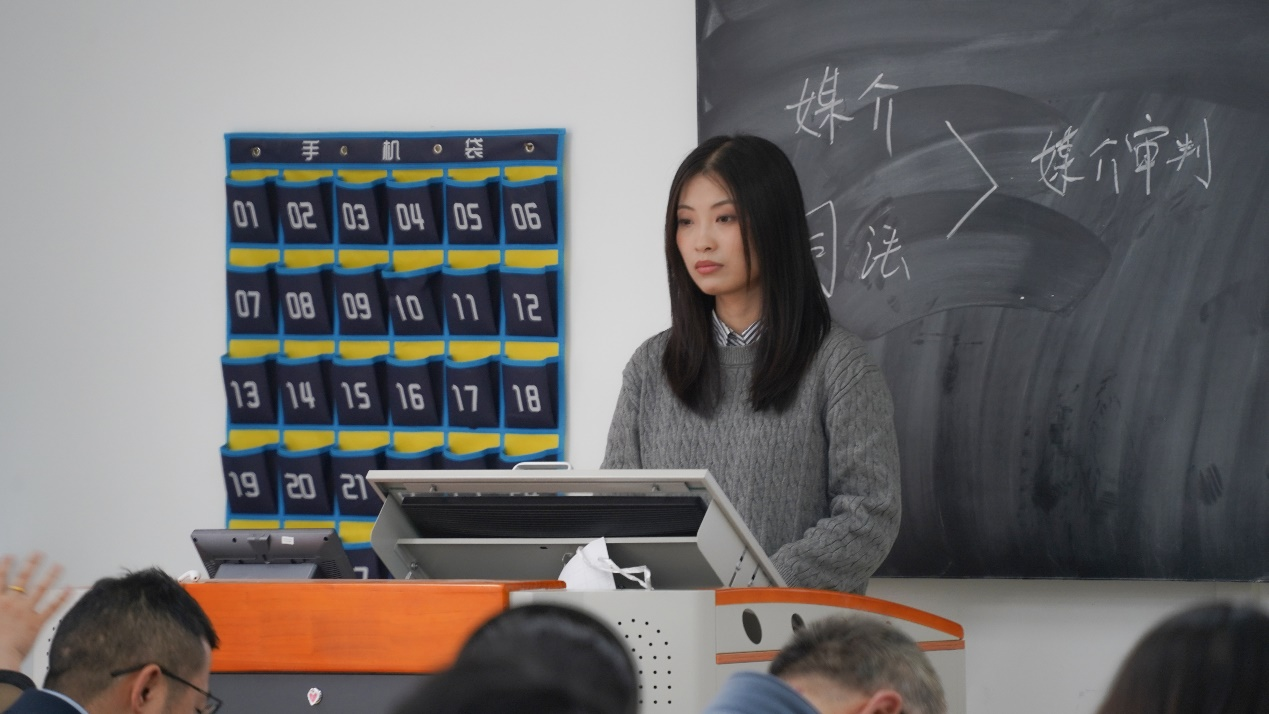 人文学院新闻系教师武璇以“新闻伦理与法规 —— 传媒与司法公正”为主题,分别从说课、学情分析和课堂教学展示分享和交流教学和创新实践,本门课程以新闻系大三本科生为授课对象,帮助学生了解新闻法律法规相关知识。武老师从报纸审判的案例引入媒介审判的概念;通过案例分析引导学生理解新闻媒介法律的边界与意识。