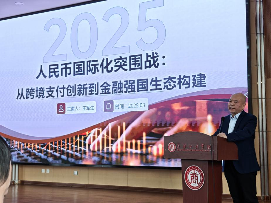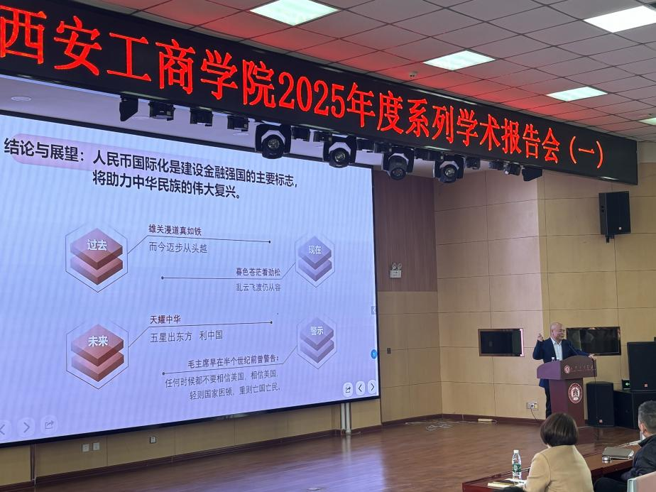 3 月 6 日下午 3 点,西安工商学院学术报告厅内气氛热烈,一场聚焦金融领域前沿议题的学术报告在此成功举行。本次报告以 “人民币国际化突围战 —— 从跨境支付创新到金融强国生态构建” 为主题,由学校科研处主办,经济与管理学院院长王军生教授担任主讲嘉宾,吸引了众多师生前来聆听,共同探索人民币国际化与金融强国建设的重要课题。