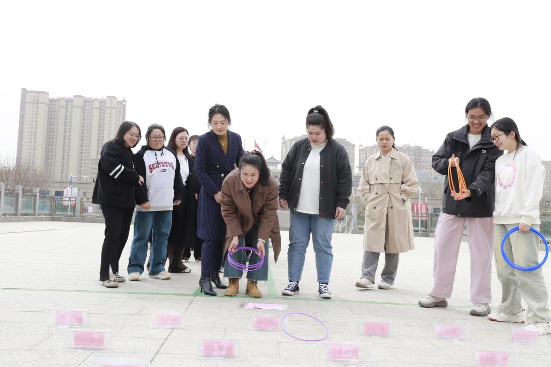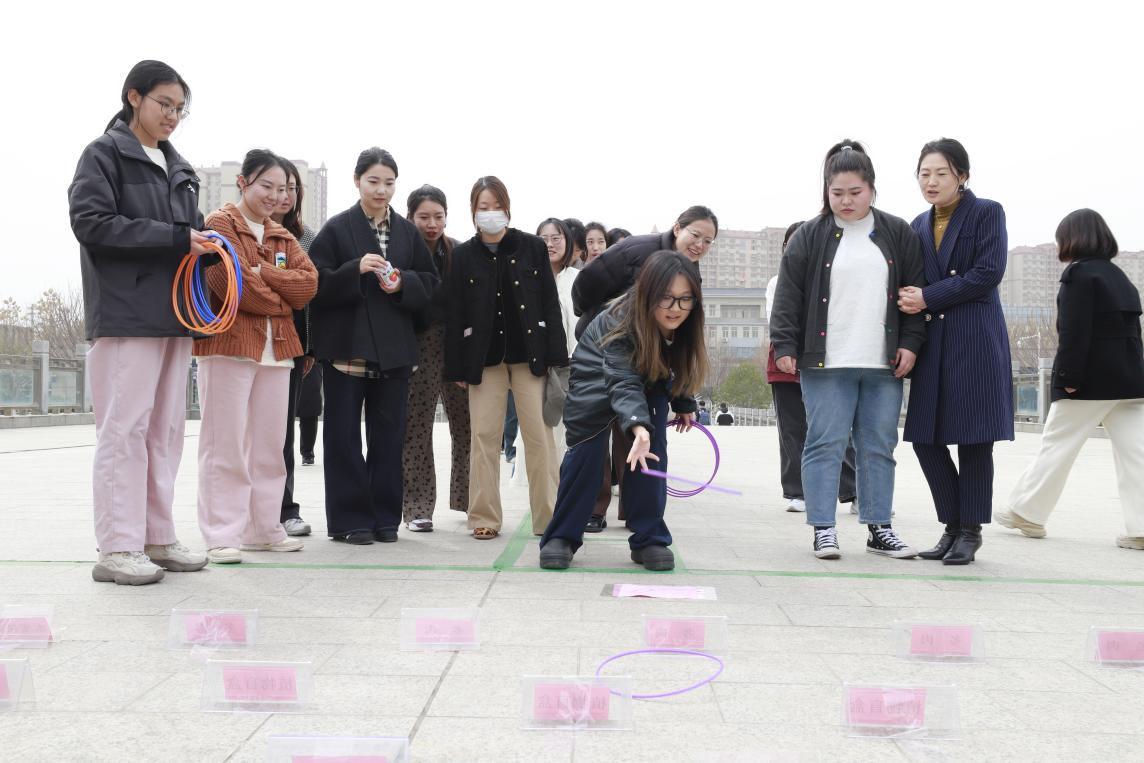 活动现场,春意融融,一片生机。泮池边,各式各样的精美花盆整齐排列,仿佛静待着每一位参与者的呵护与关爱。师生们热情高涨,满怀期待地准备在趣味套圈活动中一展身手。