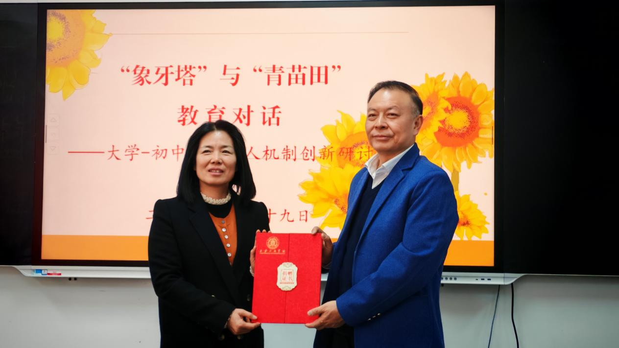 在热烈的掌声中,西安工商学院校长廖民生向鹿苑中学校长张小梅及领导颁发了“学生学业与职业成长导师”聘书,人文学院院长为该校骨干教师颁发了“实习指导教师”聘书。此次聘书颁发是两校持续深化合作的标志,更是教育初心的共鸣。