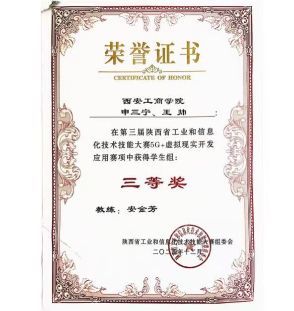 近日,第三届陕西省工业和信息化技术技能大赛组委会为获奖团队颁发了证书。我校安金芳老师带领学生团队申三宁、王帅在此次大赛中表现卓越,于5G+虚拟现实开发应用赛项里脱颖而出,喜获三等奖,为学校赢得了荣誉,也在数字媒体技术专业发展历程中留下浓墨重彩的一笔。