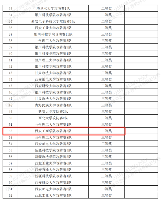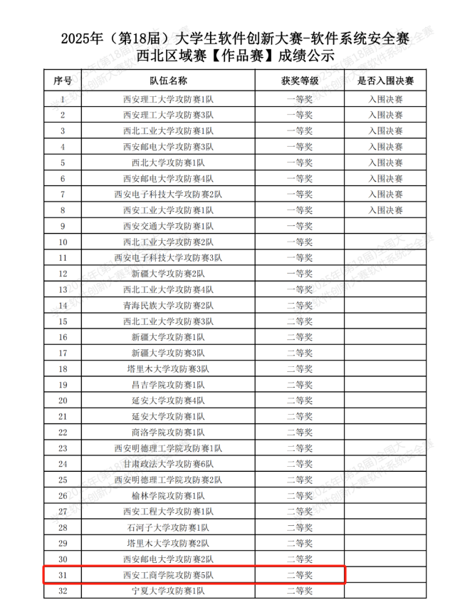 在刚刚落幕的2025年(第18届)全国大学生软件创新大赛-软件系统安全赛西北区域赛中,我校信息工程学院选派的参赛队伍表现优异,斩获佳绩。由秦龙、王飞老师指导的"西安工商学院攻防赛5队"荣获大赛二等奖,由霍雪老师指导的"西安工商学院攻防赛3队"获得三等奖。
