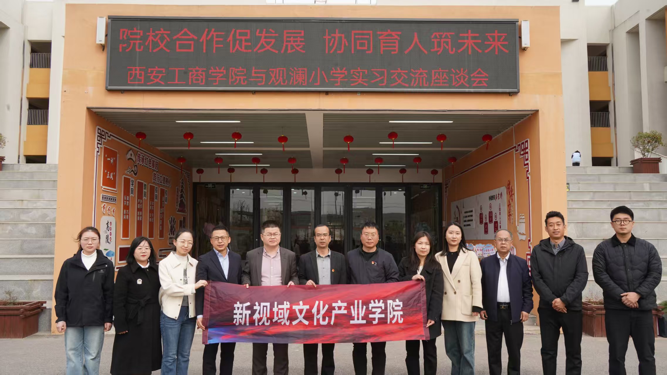 为进一步贯彻落实深化产教融合协同育人机制,访企拓岗“春季促就业攻坚行动”,切实提升应用型人才培养质量,有效增强学生职业核心竞争力,助力高质量学生就业,在新视域文化产业学院的支持与推动下,4月1日下午,西安工商学院副董事长龙和平亲自率队,偕同人文学院院长,人文学院党总支副书记、副院长原朝阳,人文学院产教融合与实践教学中心主任张欢生,新视域文化产业学院业务负责人王紫珺,教师代表相银歌、苗力元以及学生代表孙玉如、龚陈佳欣一行,前往高陵区船张观澜小学进行走访考察座谈。参加活动的还有高陵区船张观澜小学校长白光超、副校长毛雪峰等人,本次活动的主题为“院校合作促发展,协同育人筑未来”,活动由白光超和原朝阳共同主持。