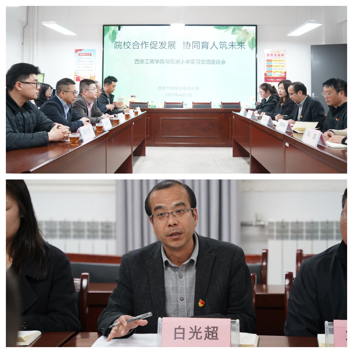 当日,西安工商学院一行人员受到了高陵区船张观澜小学的热情接待,校长白光超携校相关领导班子成员、实习指导教师等对来访人员表示热烈的欢迎,并介绍了学校的办学特色、师资队伍、教育教学成果以及在学生综合素质培养方面的探索与实践。学校注重学生的全面发展,通过开展丰富多彩的特色课程和活动,致力于打造“乐学 ”好课堂,激发学生的学习兴趣和创新潜能,为学生的成长成才奠定了坚实基础。他表示与西工商的合作,将为学校带来新的活力和发展机遇,期望借助高校的专业力量,进一步提升学校的教育教学水平,为学生提供更加优质、多元的教育资源。同时,学校也将为西工商学生实习提供充分的支持和保障,共同做好实习学生的培养工作。