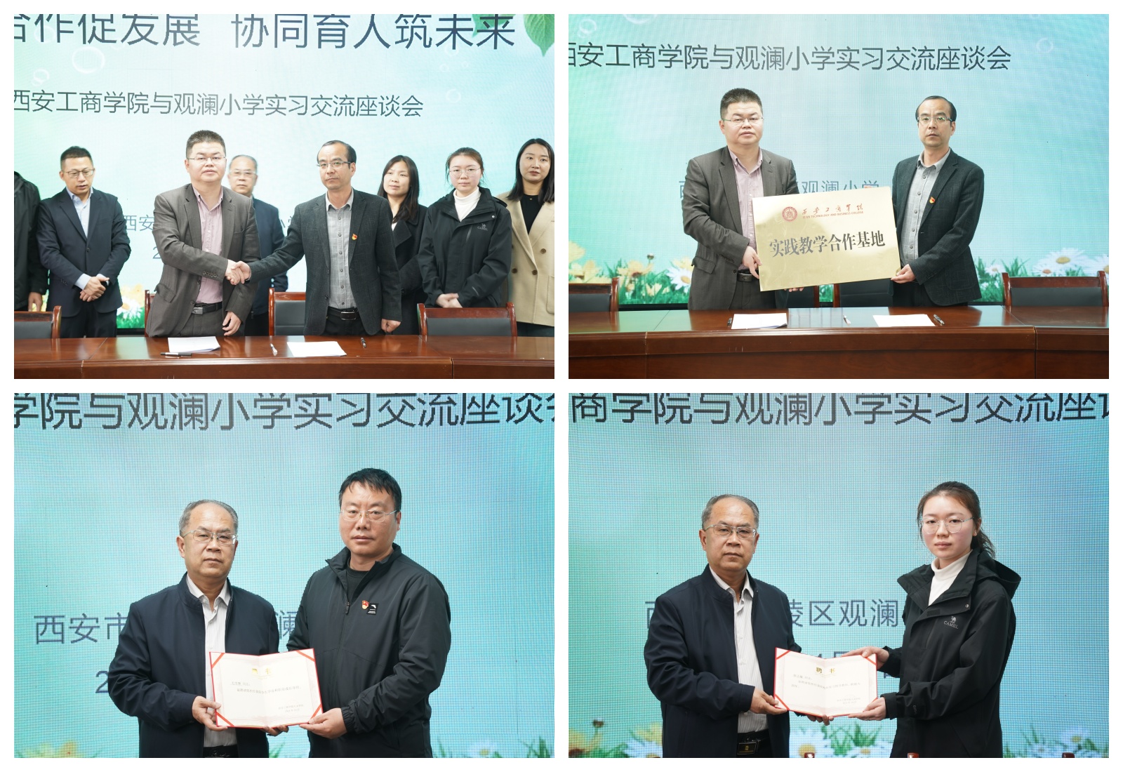 西安工商学院与船张观澜小学举行了合作签约与授牌仪式,副董事长龙和平代表学校与船张观澜小学校长白光超进行了签约,并给该校颁发了合作牌匾。副董事长龙和平、人文学院院长分别为船张观澜小学校领导、实习指导教师颁发了聘书,在热烈的掌声中双方正式确立了合作关系。随后双方交流了人文学子的实习情况,并围绕深化产教融合、创新人才培养模式、强化实践教学基地建设等核心议题,展开了深入且全面的探讨与交流,共同探寻新时代背景下教育高质量发展的新路径、新方法。