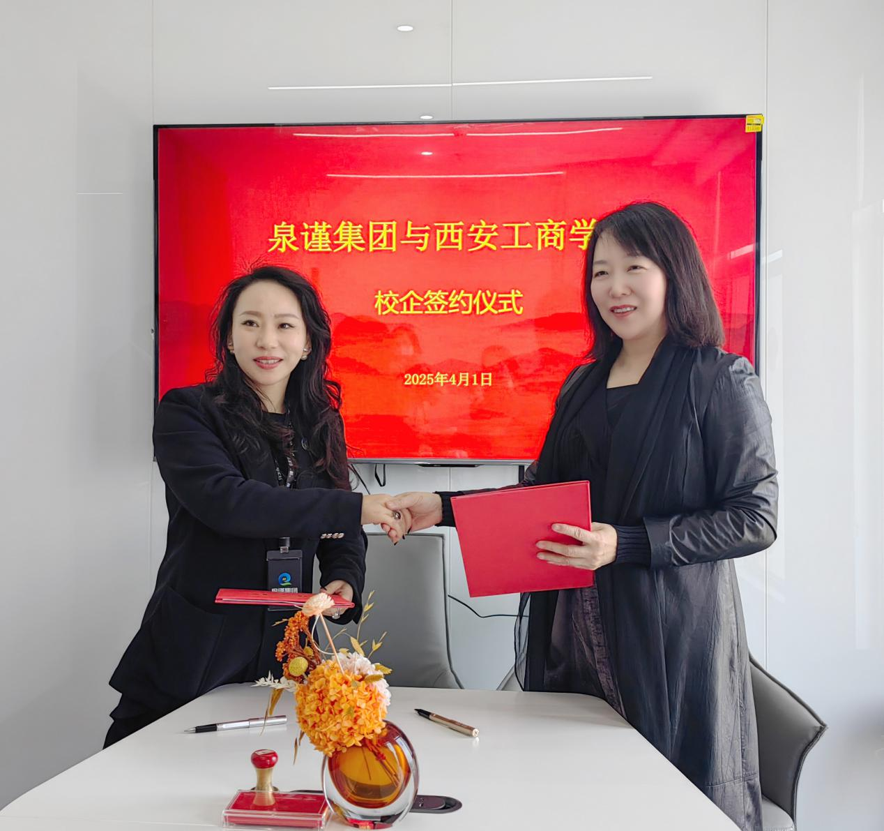 座谈结束后,西安工商学院与泉谨集团举行了校企合作签约仪式,付总表示,校企合作共育应用复合型人才是企业社会责任感的体现。社会经济的快速发展对人才提出了更高的多元化需求,打通校企共培、共育通道,将有力提升学生的实践能力和就业竞争力,实现学校、企业和学生的三方共赢。