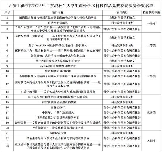 此次“挑战杯”大学生课外学术科技作品竞赛校赛决赛,不仅是西安工商学院莘莘学子展现学术创新能力的舞台,更是学校响应国家战略、为国家培育创新人才的关键举措。“挑战杯”校级决赛后,学校会继续组织专家评委对推报省赛项目进行深度打磨指导,以进一步提升项目的质量和竞争力。未来,学校将以竞赛为契机,以教育为基石,坚持以赛育才、以赛促创,营造“崇尚科学、追求真知、锐意创新”的校园文化氛围,激发学生创新活力,引领青年学子在科技强国建设中贡献智慧与力量。