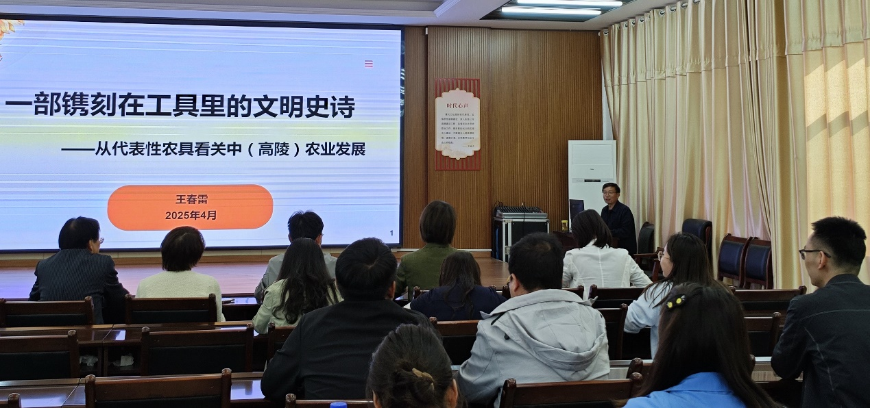 思政实践导师、庙西村乡村振兴顾问王春雷做了题为《一部镌刻在工具里的文明史诗——从代表性农具看关中(高陵)农业发展》的讲座,以古诗《悯农》中锄头与撅头的区别,说明农具在古典文明解释中的重要性。他以关中为何成为农耕文明的摇篮、高陵区农业发展史等内容,论述了农业发展的另一关键因素为持续迭代的农具,又以杨官寨遗址中出土的石铲、石刀说明了原始社会时期从刀耕火种到翻土耕作的转变。