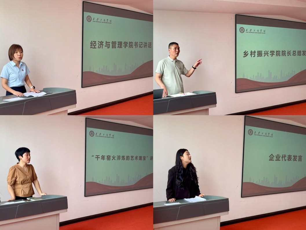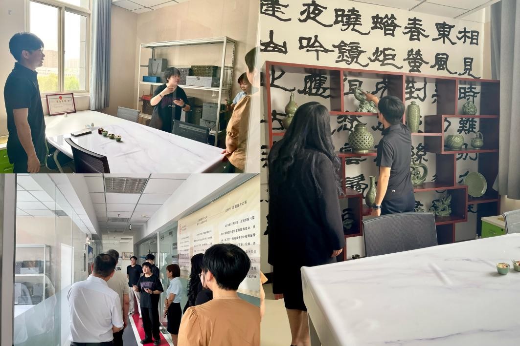 活动最后,全体参会人员实地参观514工作室,感受耀州瓷"巧如范金,精比琢玉"的工艺精髓。陕西省工艺美术大师王燕利带来主题讲座"千年窑火淬炼的艺术瑰宝—中国耀州瓷"。经济与管理学院书记李会萍从党建引领角度强调文化传承使命,要求师生党员在工作室运营中发挥先锋作用。期待同学们做传统工艺的"数字翻译官",运用新媒体技术讲好青瓷故事。成为文化出海的"青年使者",在跨境电商实践中传播中国美学,学院将提供广阔舞台支持大家的奇思妙想。乡村振兴学院院长伍建文表示,工作室将构建"技艺传承+商业孵化"双轨培养模式,学生通过接触行业前沿、参与实践项目的机会,为今后的专业学习和创作积累经验。