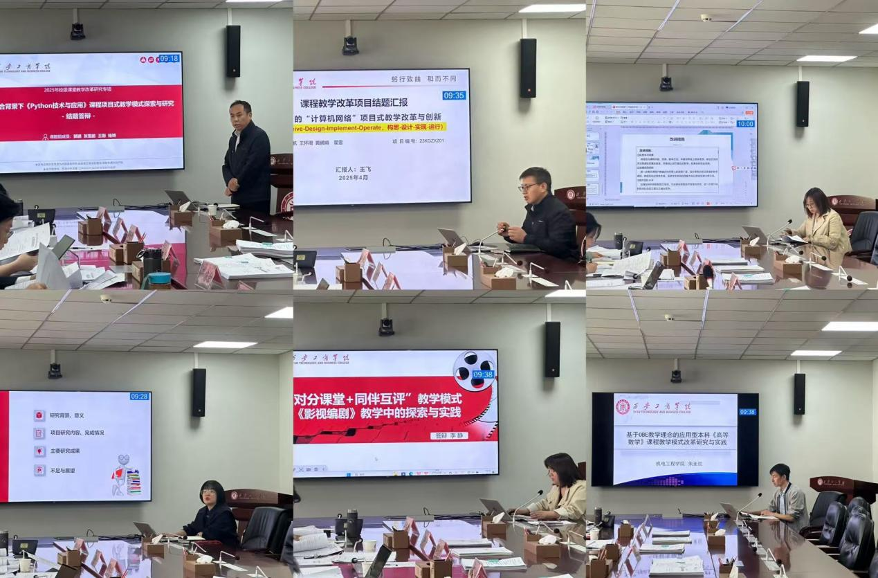 随后答辩评审正式开始,参与本次课堂教学改革专项重点项目结题答辩的共计6项。各项目主持人按序进行PPT演示,围绕项目完成情况、主要成果、存在问题与改进措施等内容,向校内外各评审专家进行了全面阐述。