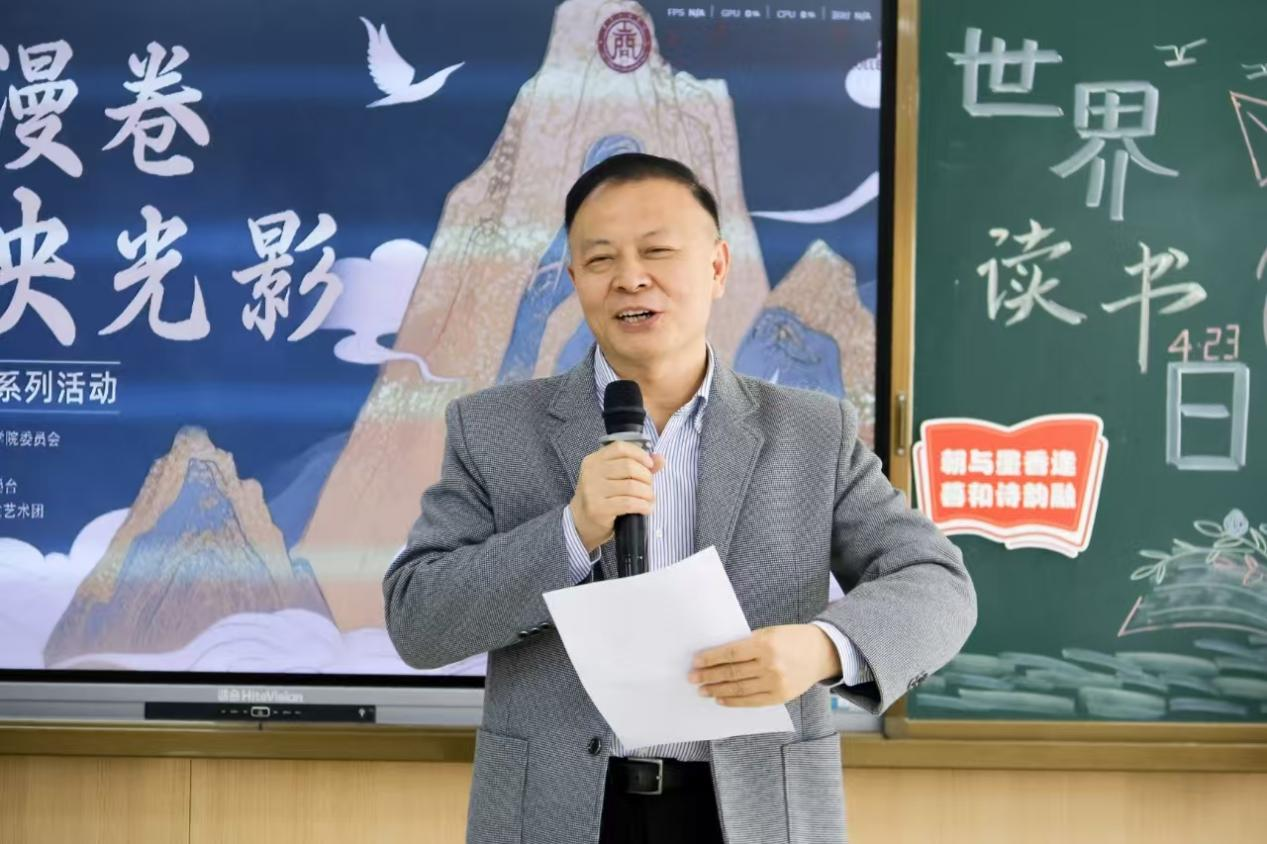 最后,人文学院教学副院长原朝阳深情寄语。他引用明代思想家王阳明的名言“知者行之始,行者知之成”,指出阅读不仅是知识的积累,更是实践的开端,书中的智慧不应停留在纸面,而要化作脚下的路,指引我们在生活中践行所学。他进一步阐发了阅读的意义:“阅读能够帮助我们不断成长,向着理想中的自己稳步迈进。在这个过程中,我们或许会不断蜕变、遇见更好的自己,但无论走得多远,都别忘了最初翻开书页时那份纯粹的热爱与求知的初心。”他寄语青年人,希望书籍能够成为照亮前路的明灯,陪伴大家在探索与实践中,书写属于自己的精彩人生。