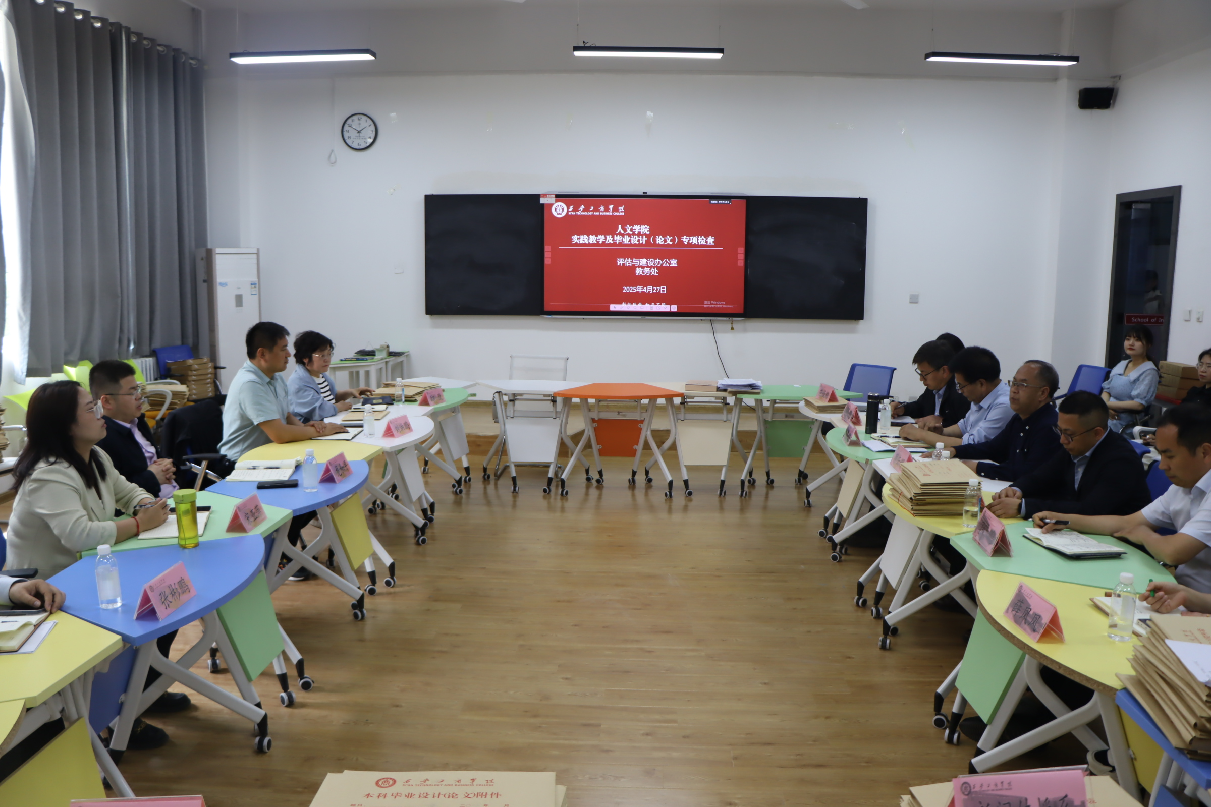 为深入贯彻落实 “以评促建、以评促改、以评促管、评建结合、重在建设” 的方针,全面提升实践教学质量,强化毕业论文(设计)管理,4月27日下午我校组织开展人文学院实践教学与毕业论文(设计)专项检查工作。此次专项检查工作由学校副董事长龙和平亲自带队,参与人员包括无边界育人小组成员、评估与建设办公室与教务处相关职能部门负责人及工作人员、各二级学院相关负责人及人文学院全体领导班子成员,以及该院当日无教学任务的教师。