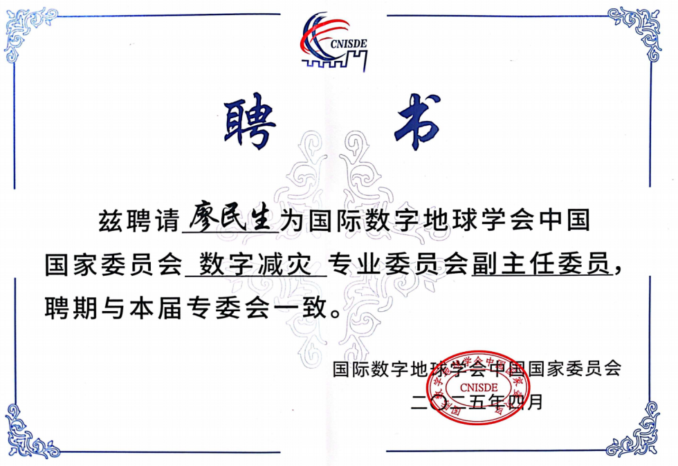 4月,国际数字地球学会中国国家委员会正式宣布数字减灾专业委员会新一届领导机构名单,我校校长廖民生获聘为副主任委员。