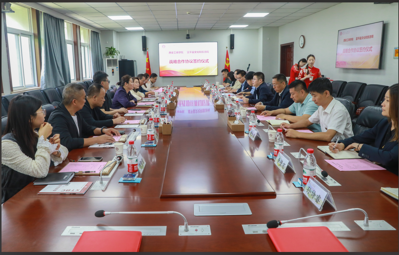 签约仪式在我校行政楼三楼会议室举行。富平县政府参加会议的领导还有文化和旅游局党委书记、局长李敏,副局长孙守奎,局办公室主任李佳琦,阿宫团长王革委,副团长雷凯强、李海峰、李曼,政府办干部张雪榕。西安工商学院参加会议的还有教务处处长刘洪鹏,艺术与传媒学院执行院长唐红春,党总支书记、学工副院长宋亚萍,校团委李璧茜,艺传编导系主任李静,实验中心主任刘康奇、学工副院长助理孙诗睿。