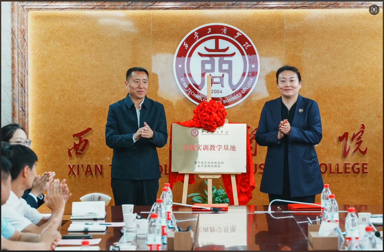 富平县文化和旅游局局长李敏同西安工商学院副校长程波代表双方合作单位 ,在“非遗传承、协同育人战略合作协议书”上签字。协议书本着:资源共享、优势互补、互惠双赢、共同发展的合作原则,重点落实学生实习基地建设专题片拍摄、高雅戏曲进校园共同建设戏曲传承与影视基地创作中心,以及双方联动开展研究工作等五个方面。