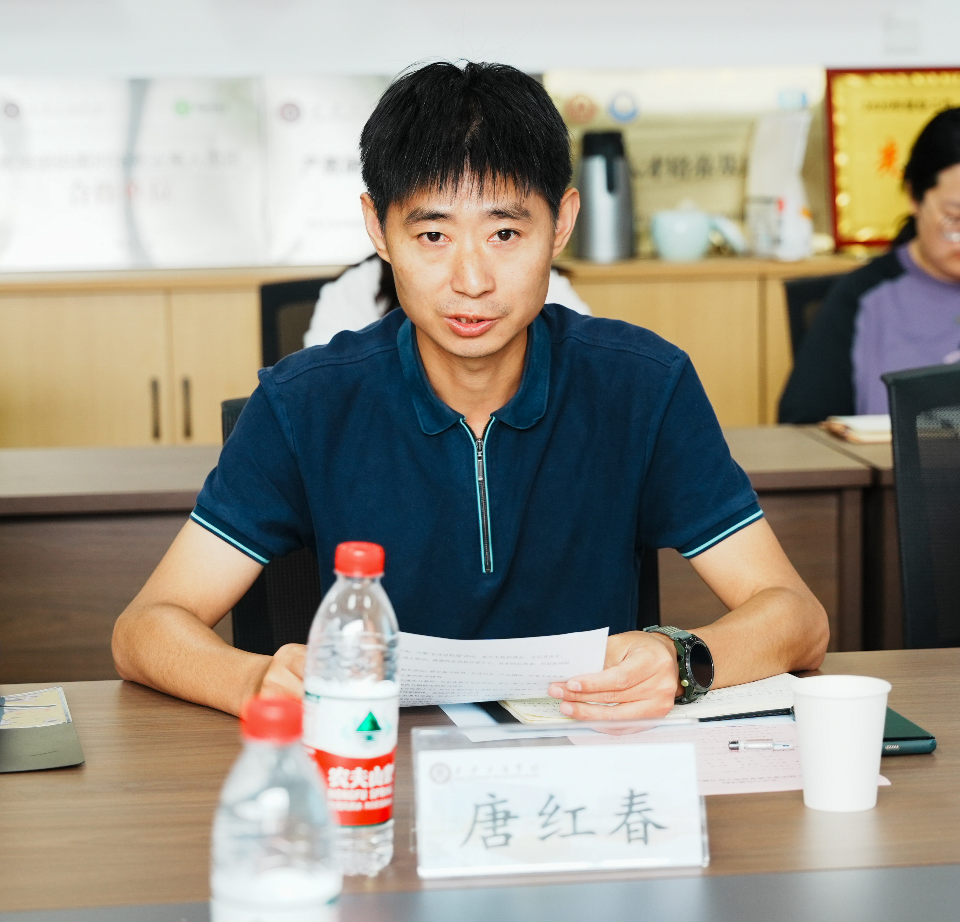 执行院长唐红春围绕访企拓岗专项工作进行汇报。他表示,学院领导班子高度重视校外实习基地建设,目前已与富平县文化和旅游局、西安未来文化科技有限公司等多家企事业单位达成合作意向,部分合作正在持续推进。唐院长讲到,下一步学院将以企业需求为导向,结合学院专业特点,推动校企合作常态化,通过定期走访、校企座谈、共建实习基地等方式,设立实习就业一体化基地,提供长期稳定的实习岗位,联合企业共同培养人才,为学生提供更多实习机会。同时为教师提供更多锻炼机会,将企业的项目技术标准融入到课堂教学当中,开发双师型课程,提高教育教学质量。