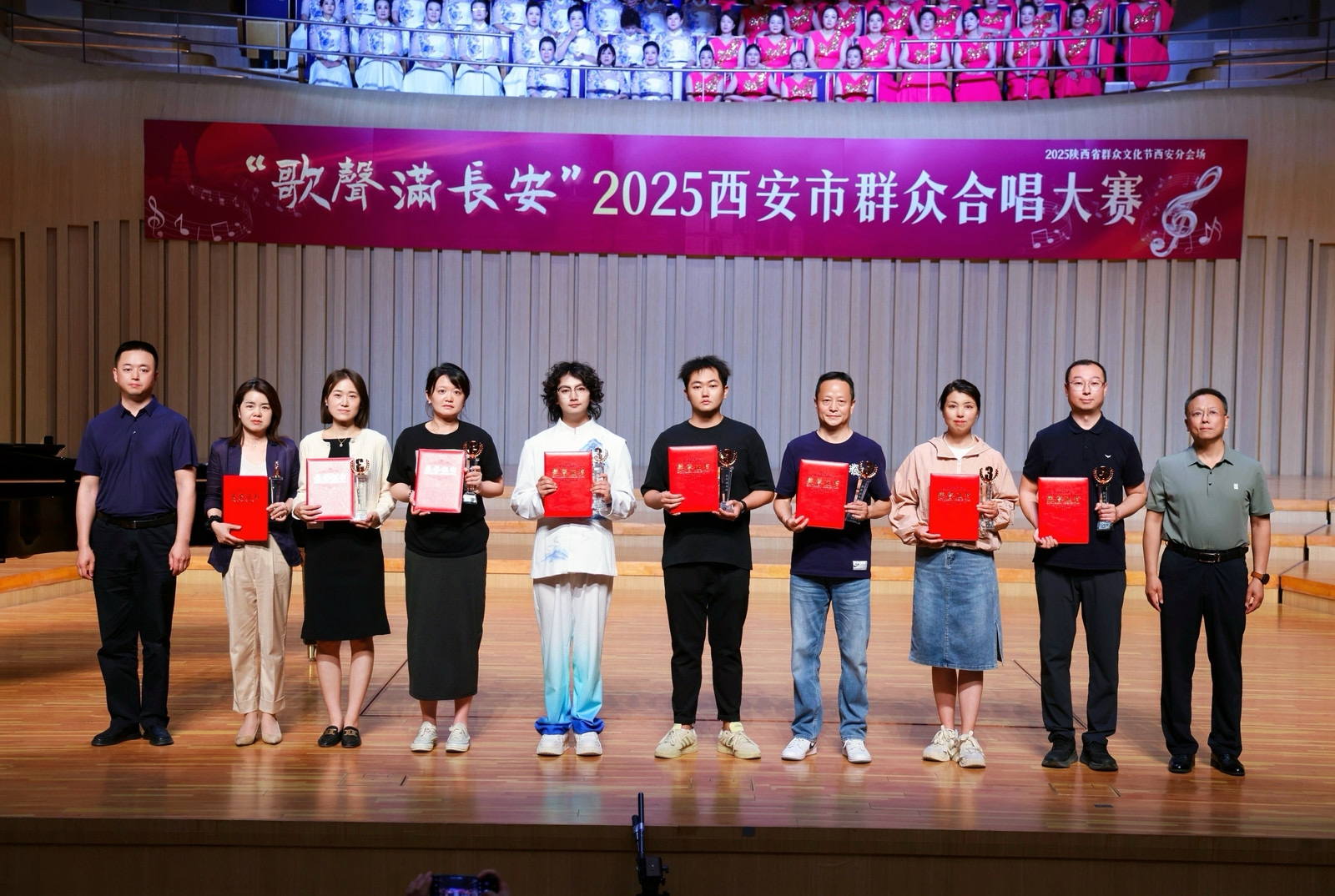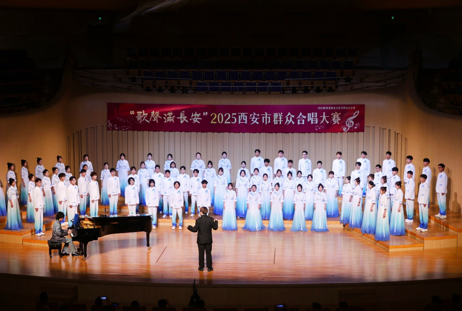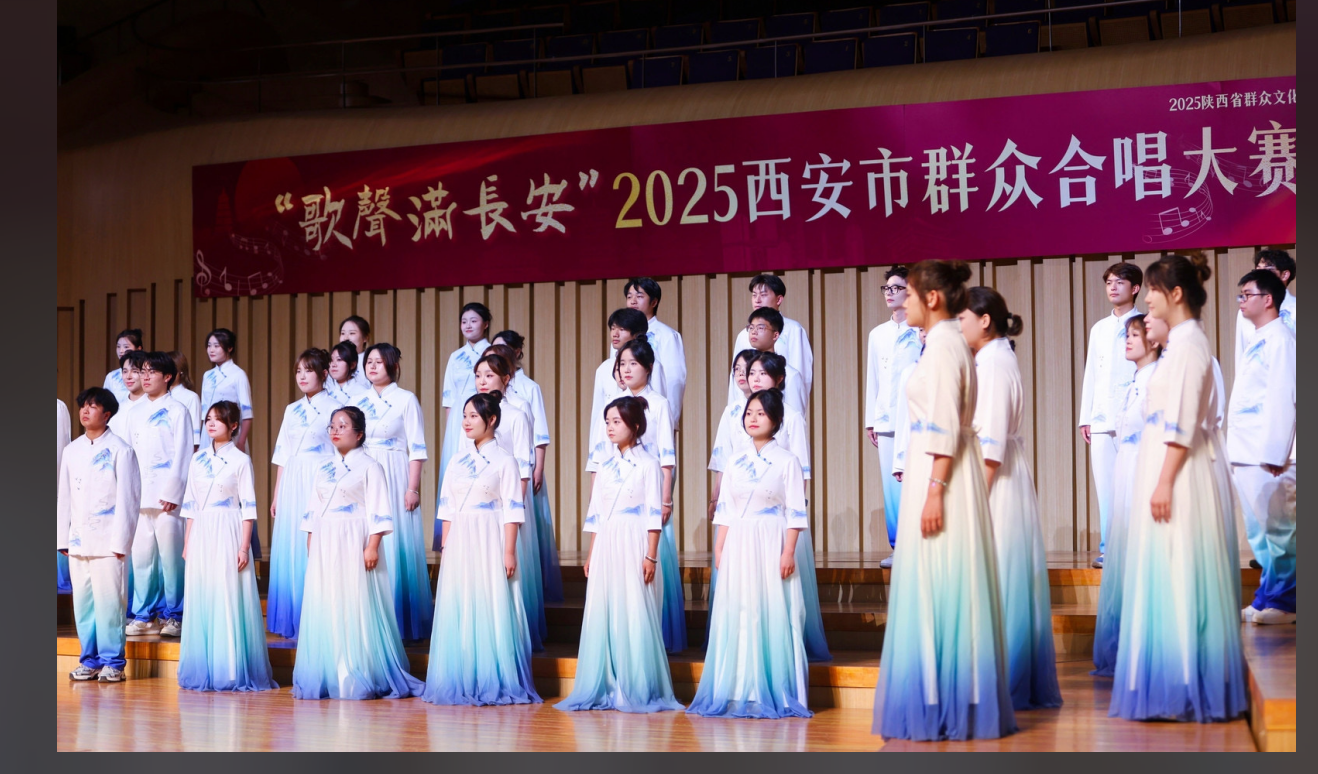 5月14日,由西安市文化和旅游局主办的"歌声满长安·2025年西安市群众合唱大赛"在长安乐无界长安一带一路文化艺术中心圆满收官。西安工商学院大学生艺术团鹿鸣合唱团代表高陵区参赛,以76名团员的默契协作、指挥陈向昊的精准把控及钢伴夏俊栋的灵动协奏,凭借作品《世界赠予我的》的精湛演绎,从全市优秀合唱团队中脱颖而出,荣获大赛三等奖,为区域文化艺术事业再添亮眼硕果。