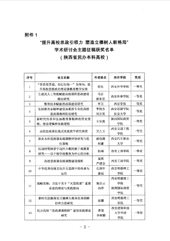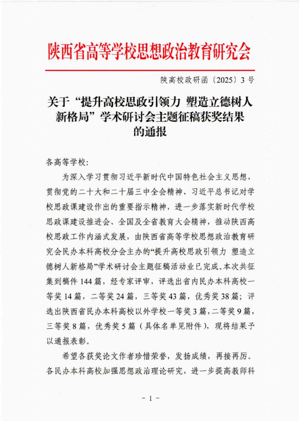 为深入学习贯彻习近平新时代中国特色社会主义思想:贯彻党的二十大和党的二十届三中全会精神、习近平总书记对学校思政课建设作出的重要指示精神,进一步落实新时代学校思政课建设推进会、全国及全省教育大会精神,推动陕西高校思政工作内涵式发展,由陕西省高等学校思想政治教育研究会民办本科高校分会主办的“提升高校思政引领力塑造立德树人新格局”学术研讨会主题征稿活动圆满完成。