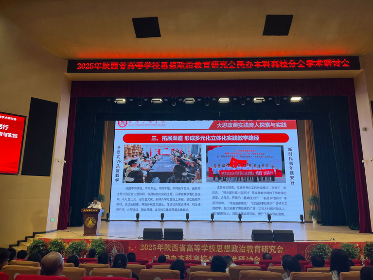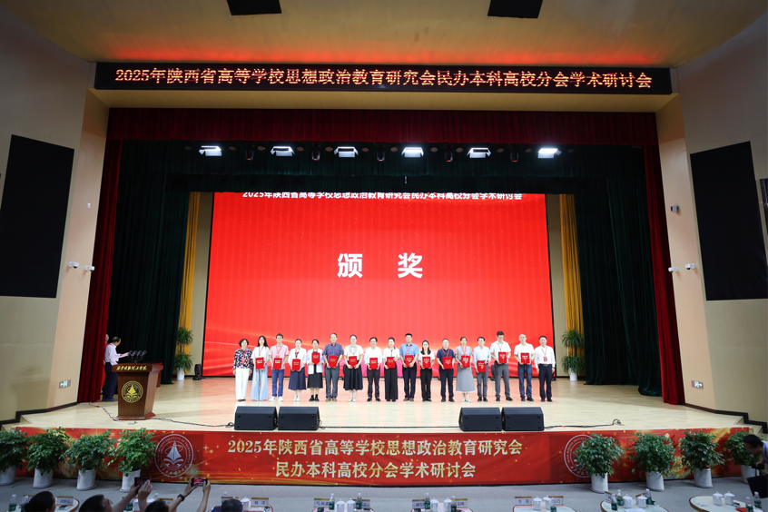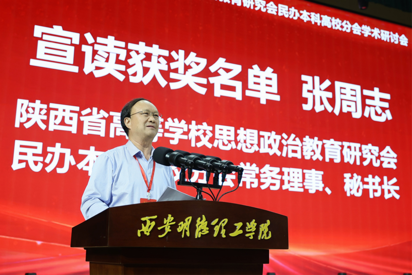 报告结束后,陕西省高等学校思想政治教育研究会民办本科分会常务理事、秘书长张周志宣读获奖名单。西安明德理工学院党委书记马川鑫、西安交通工程学院党委书记李萍为获奖论文作者颁发优秀论文奖证书,马克思主义学院院长严建会作为我校获奖教师代表上台领奖。
