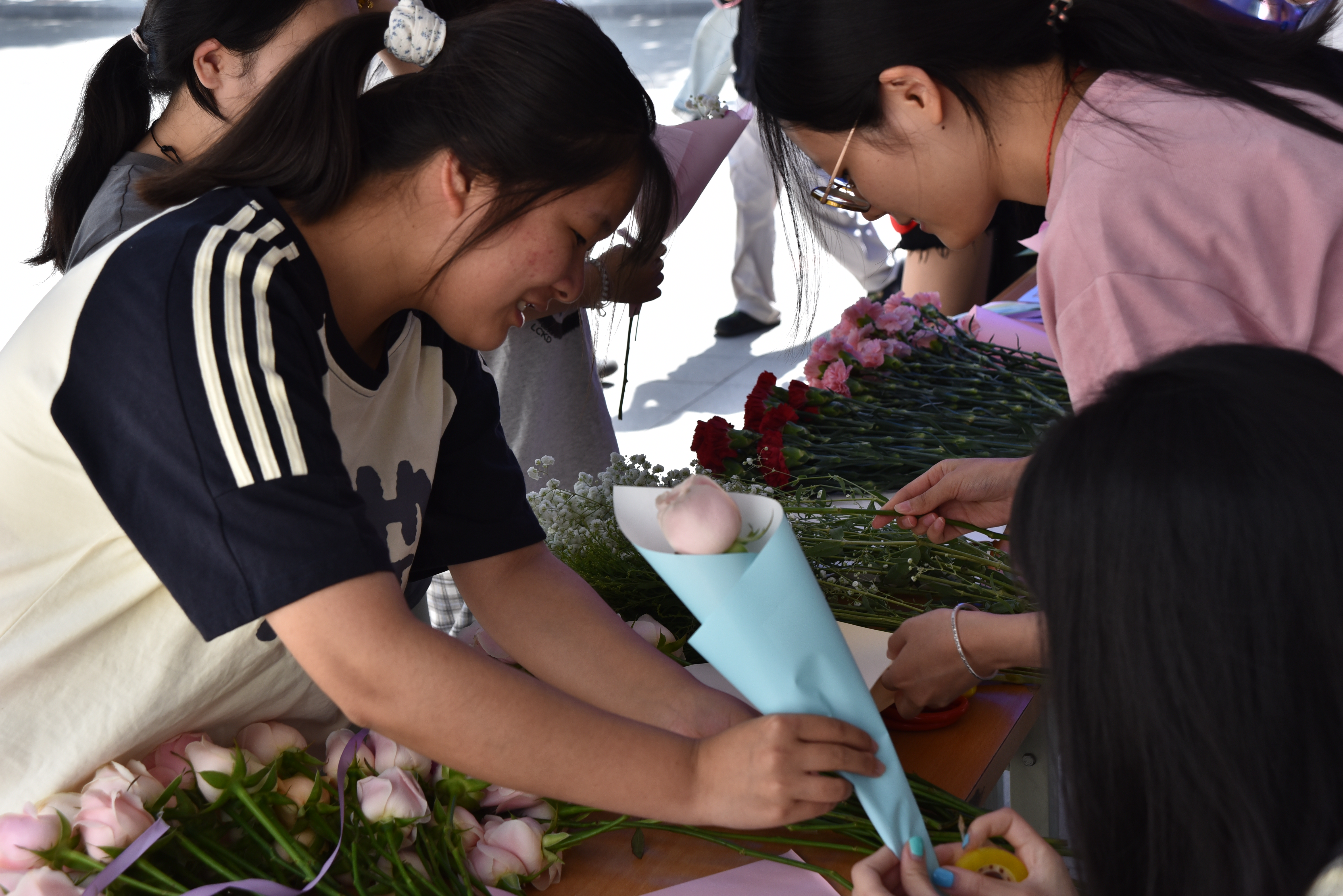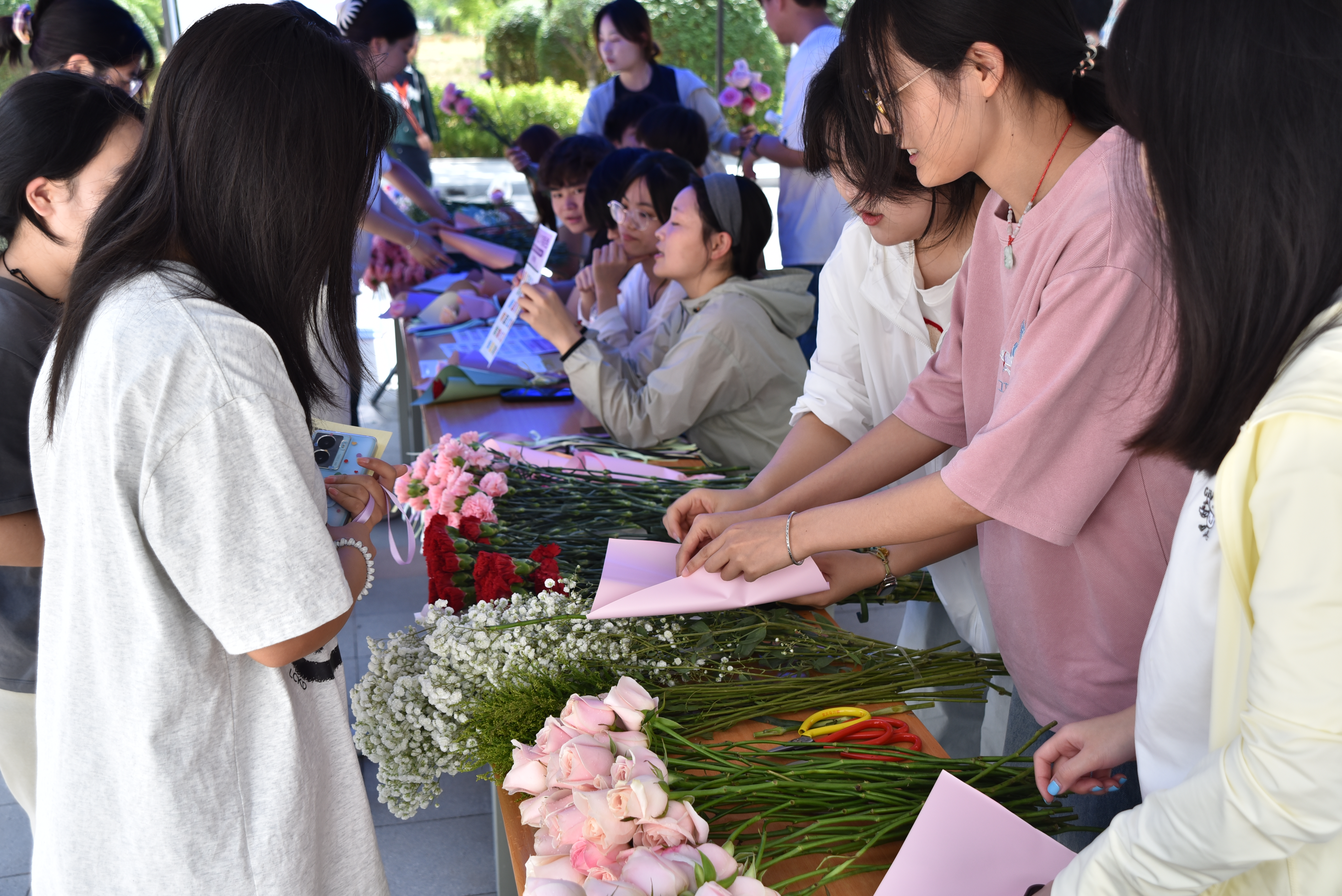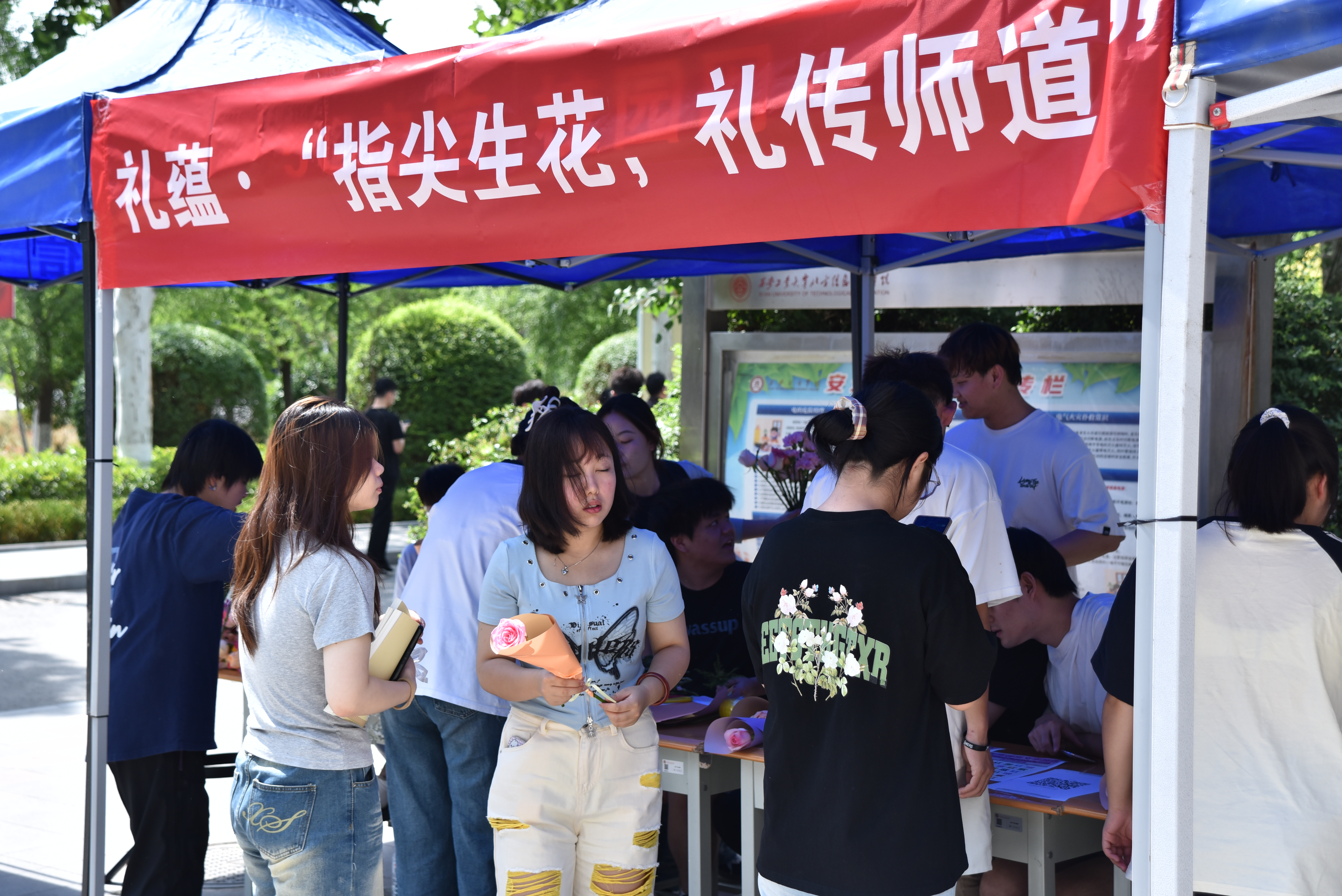 走近柳湾公寓的“指尖生花”活动现场,花香与温情扑面而来,感受德育专区的温暖。同学们以传统花道为媒介,亲手挑选鲜花种类、设计专属花礼,将插花时的专注化为对师长的感恩之情。完成作品后,参与者写下祝福卡片,将花束赠予指定对象,用镜头记录传递温暖的瞬间。那些羞于表达的爱与感谢,都将借一花一叶悄然绽放。一位参与的同学感叹:“原来插花时的心流,真的能让说不出口的感谢变得具体”!