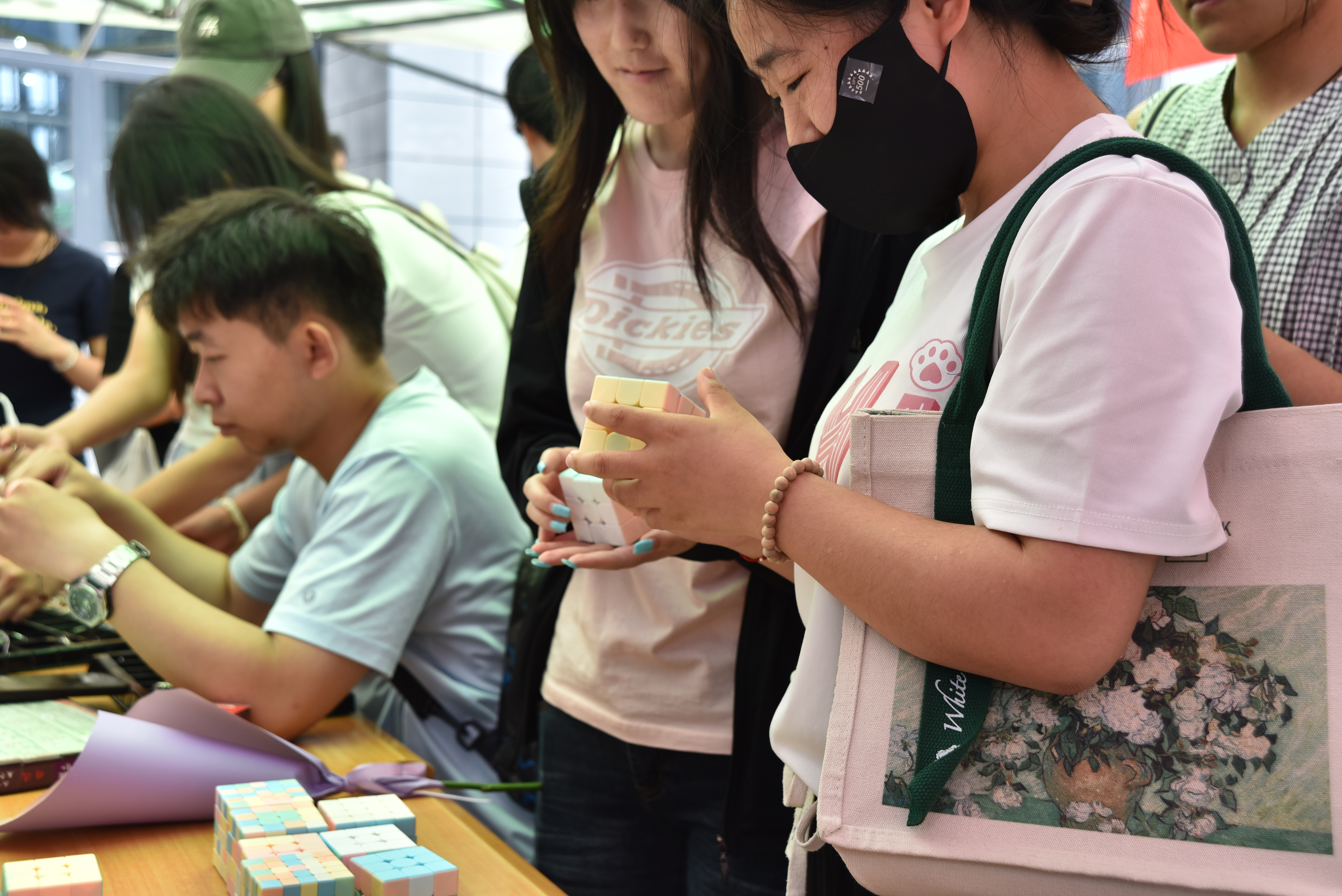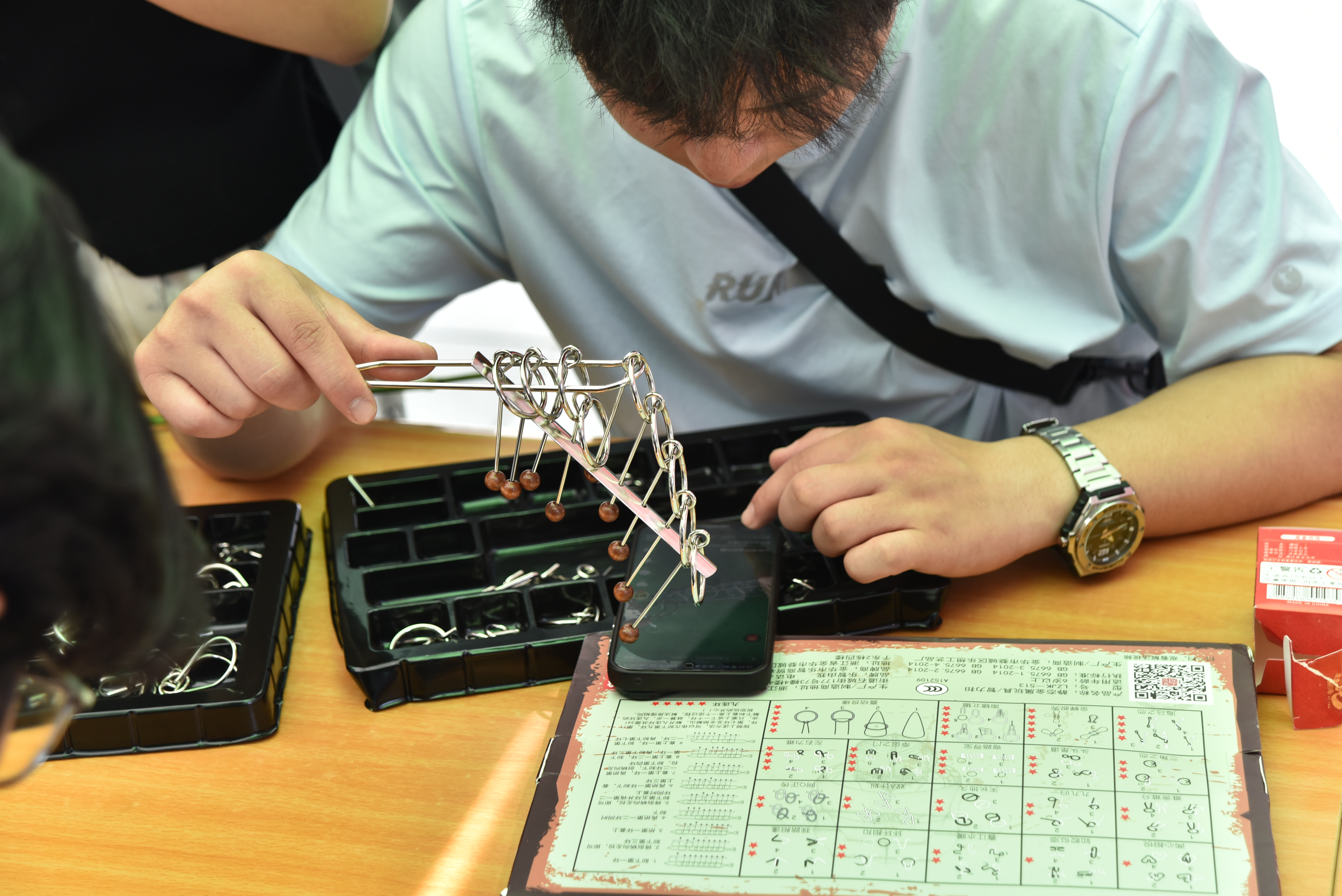 走近渭上公寓的智育专区,传统智慧与现代思维的对话在此悄然生发。九连环的金属碰撞声与华容道的滑动声交织成思维的乐章,魔方的棱角飞转,一场跨越时空的思维碰撞在此热烈展开。同学们沉浸于九连环的精密拆解、华容道的逻辑推演与魔方的空间重构中,指尖跃动的不只是机关与方块,更是对专注力与创造力的深度唤醒。挑战限时解谜,成功解锁机关者获得了我们的精美小礼物。“这些游戏让我重新体验了心无旁骛的思考状态”,一名参与学生感叹道。智育不仅是知识的积累,更是一场与自我认知博弈的修行——以古器润今思,让深度思考成为青春最美的注脚。当数字时代的碎片化信息困扰着专注力,这些传承千年的益智游戏正以数学之美与哲学之思,为年轻的心灵按下“重启键”。