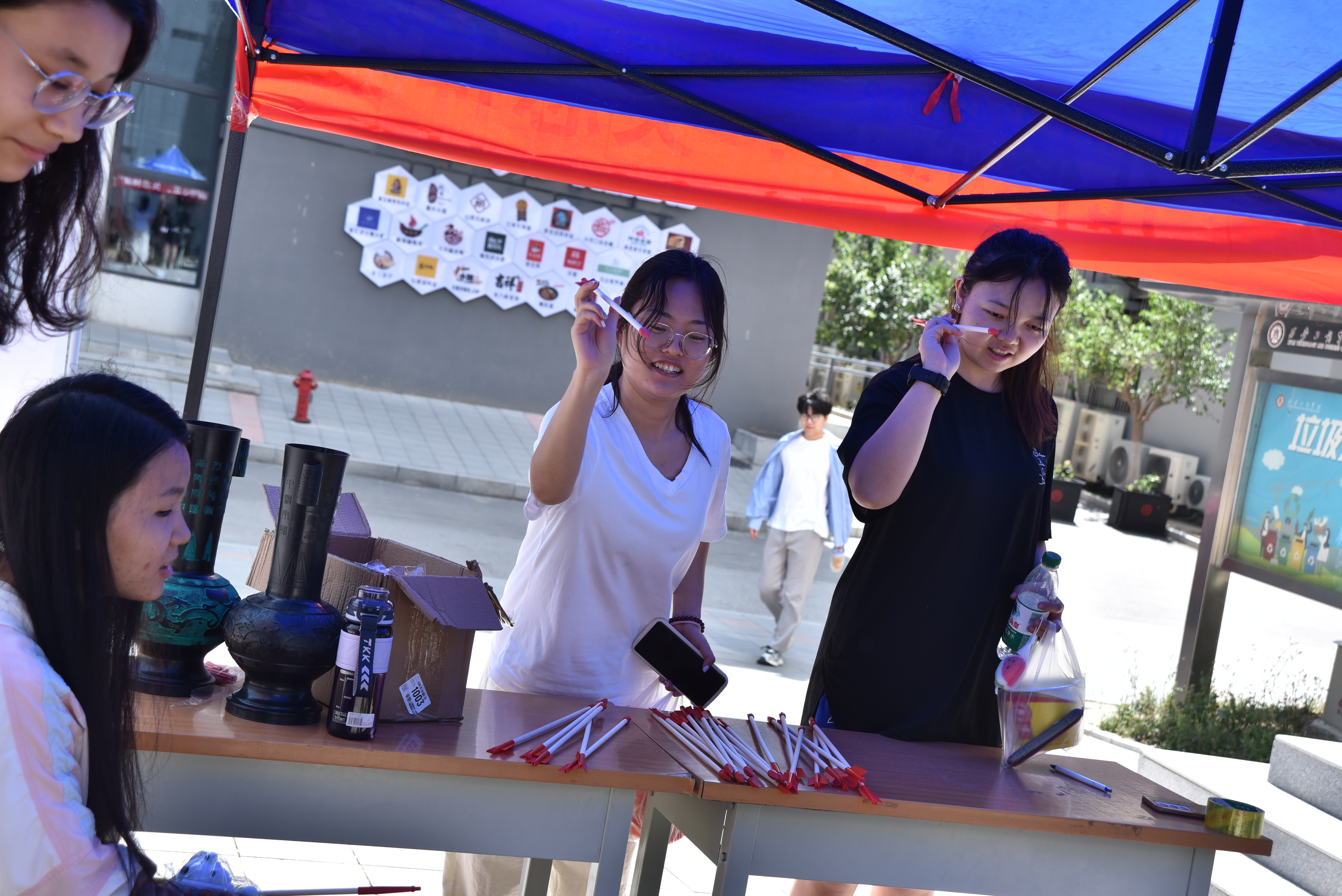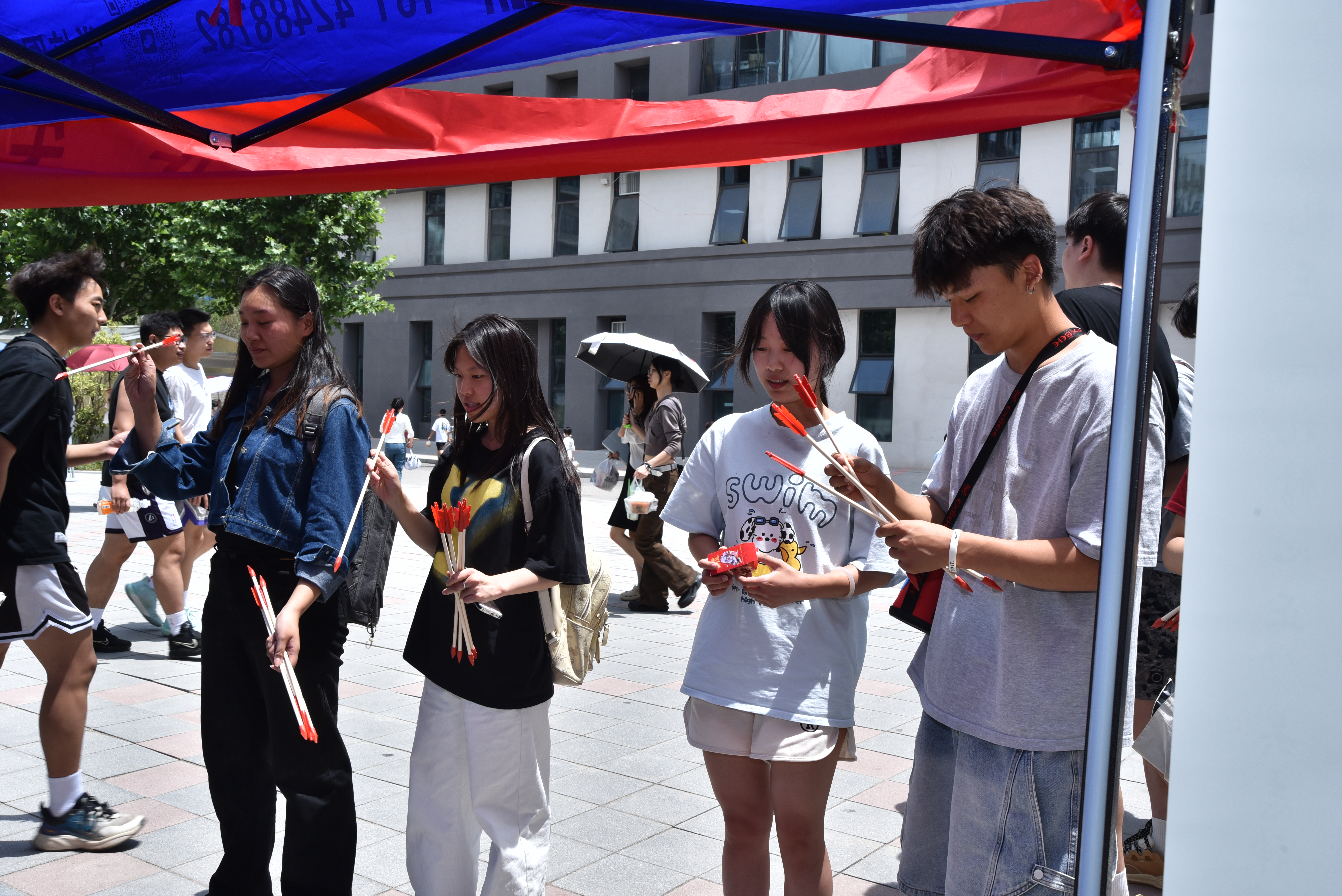 渭上公寓前的投壶现场让我们一起走进体育专区,一场跨越千年的“君子之争”正式开启。参与者每人领取10支箭矢,投中3支即可获得精美小礼物。活动现场,同学们激情澎湃,热情参与,志愿者们会引导大家在竞技中学会平衡得失心。“投壶前心里很紧张,但当箭射出去的瞬间,突然就平静了”。一位刚完成挑战的同学笑道。