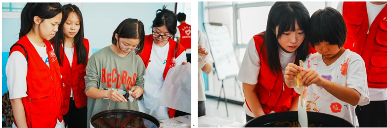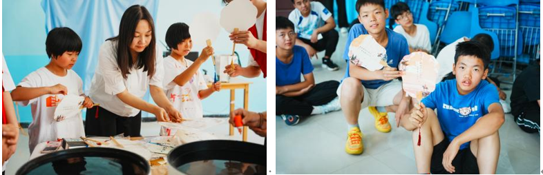 制作非遗漆扇环节,孙诗睿同志为孩子们讲解非遗漆扇历史渊源,详细讲解制作步骤。志愿者们精心筹备,将各类制作漆扇的材料整齐地摆放在桌上。在志愿者的协助下,孩子们先是在水钵中滴入自己喜欢的颜色,随后轻轻握住扇柄进行旋转,随着一把把精美的漆扇逐渐成型,孩子们的脸上绽放出自豪的笑容。他们互相展示自己的作品,分享制作过程中的趣事与心得,非遗漆扇制作活动在欢声笑语中圆满落幕,这不仅是一场简单的手工制作活动,更是一次深刻的文化传承之旅,通过亲身体验漆扇制作,孩子们感受到非遗文化的博大精深,也在潜移默化中增强了文化自信。