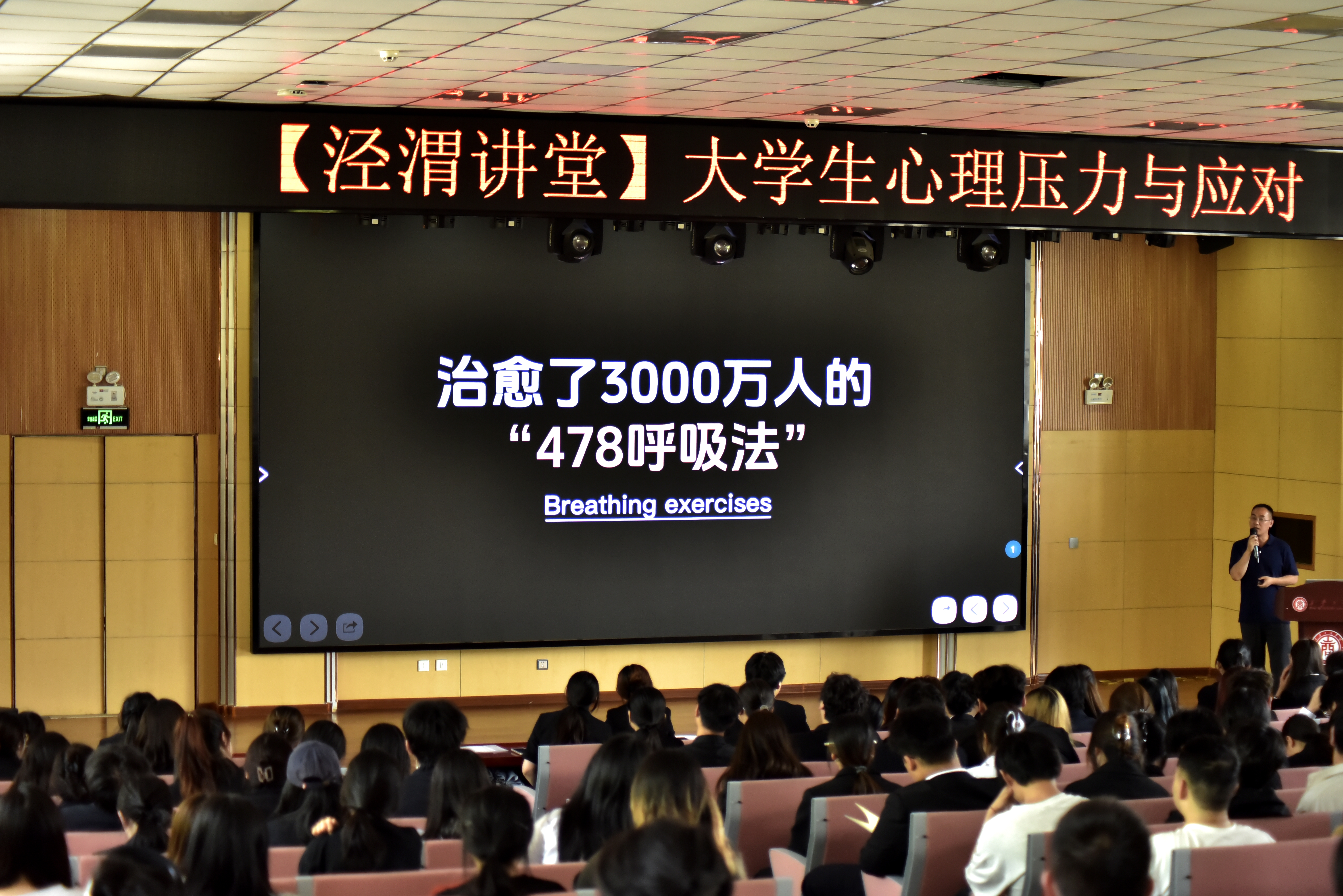 讲座特别设置“压力放松”环节,当大屏幕播放4-7-8呼吸法教学视频时,全场同学跟随指导进行沉浸式体验——吸气4秒、屏息7秒、呼气8秒的韵律呼吸,让报告厅瞬间成为释放压力的能量场。“感觉紧绷的肩膀瞬间放松下来了”!学生们惊喜地分享感受。