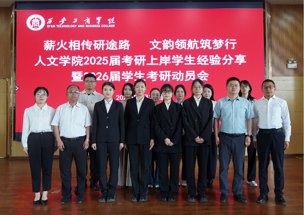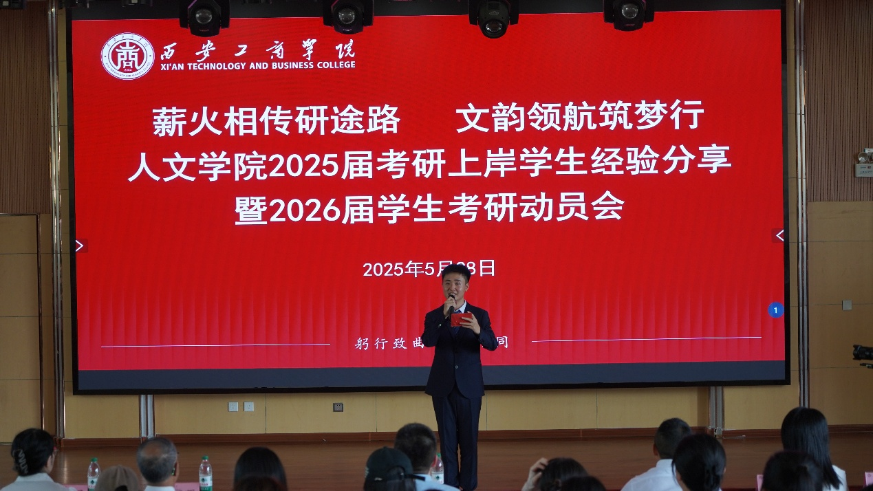 5月28日下午,人文学院2025届考研经验分享暨2026届考研动员大会在学术报告厅隆重举行,西安工商学院副董事长龙和平,人文学院院长,人文学院党总支副书记、副院长原朝阳,人文学院党总支书记、副院长王园园,国际教育学院留学服务中心主任乔奕桐,人文学院教师和辅导员以及2026届、2027届学生等师生齐聚一堂,共启考研逐梦之旅。