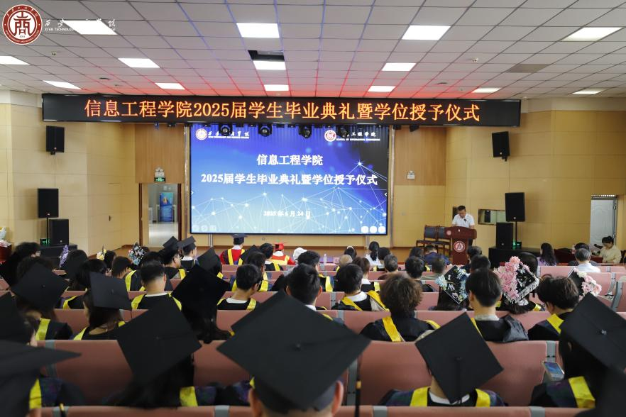 6 月 24 日上午,西安工商学院信息工程学院 2025 届学生毕业典礼暨学位授予仪式在学术报告厅隆重举行。800 余名信息学子齐聚一堂,带着母校的殷切嘱托,正式启航人生新征程。西安工商学院校领导杨欣欣、信息工程学院院领导李恒、张琳、王飞及教师代表出席本次仪式。本次活动由信息工程学院党总支书记学工副院长李恒老师主持。