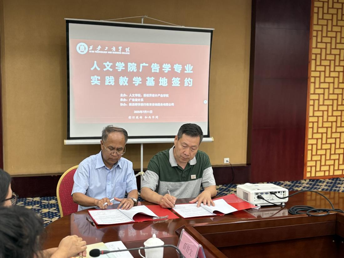 会议伊始,陕西研学旅行教育咨询服务有限公司副总经理李艳武详细介绍了公司的发展历程、业务布局及校企合作规划。他表示,陕西研学深耕文旅教育领域,拥有丰富的产业资源和实践经验,未来将为人文学院学子提供更多实习就业机会,助力专业人才培养与市场需求精准对接。随后,在签约仪式中,人文学院院长代表我院与陕西研学旅行教育咨询服务有限公司董事长乔海旭签订合作协议。