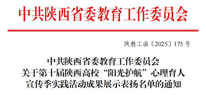 近日,中共陕西省委教育工委公布第十届陕西高校“阳光护航”心理育人宣传季实践活动成果表扬名单。我校心理育人成果历经前期培育、校级遴选至省级角逐的层层筛选,最终有四项成果荣登省级表彰榜单。此次是我校在省级心理育人评选中首次实现高获奖率的重大突破,充分彰显了学校心理健康教育工作体系化建设的显著成效。
