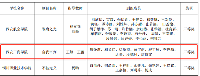 原创剧目《自我审判》(指导教师:王婷、王蕾;剧组成员:机电工程学院詹铮淇、人文学院相又仁、艺术与传媒学院徐康杰、经济与管理学院黄宇萌、经济与管理学院程宇辰、机电工程学院李烨基、经济与管理学院唐嘉、经济与管理学院段懿珂、机电工程学院高博文)荣获三等奖。该作品以大学生自我认同困境为主题,通过艺术化表达探索心灵成长路径,以真挚表演诠释青春蜕变,展现了我校“以剧润心”的美育实践成果。
