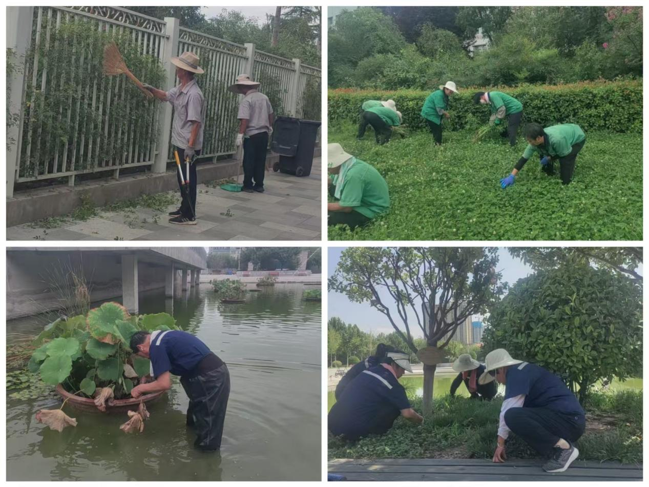 绿化养护,扮靓校园美景。绿化保洁人员持续开展绿篱修剪,高温病虫防治、清除枯树枯枝等,高标准做好绿化养护工作,面对极端天气,积极开展抗旱浇灌工作、彻底清理泮池,冲洗室外雨棚,擦洗玻璃等工作,让校园的每一个角落都焕然一新,保证校园美化“不停步”。