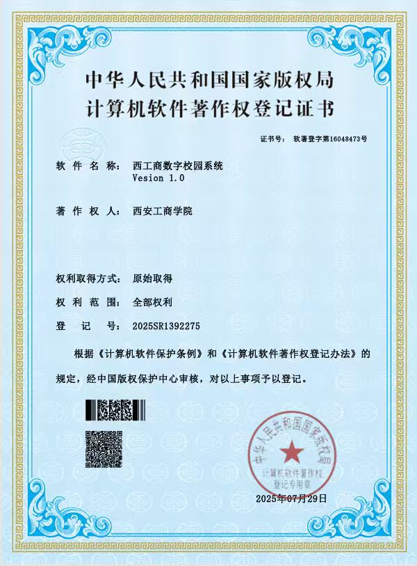 近日,西安工商学院教师:朱俊宇、张琳、王佳婧、靳亮亮、孙泽鹏五位教师联合研发的“西工商数字校园系统V1.0”成功获得国家计算机软件著作权登记。西工商数字校园系统是西安工商学院顺应教育信息化发展趋势,基于"互联网+教育"理念精心打造的智慧校园移动端综合服务平台。作为学校数字化转型的重要载体。