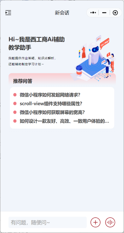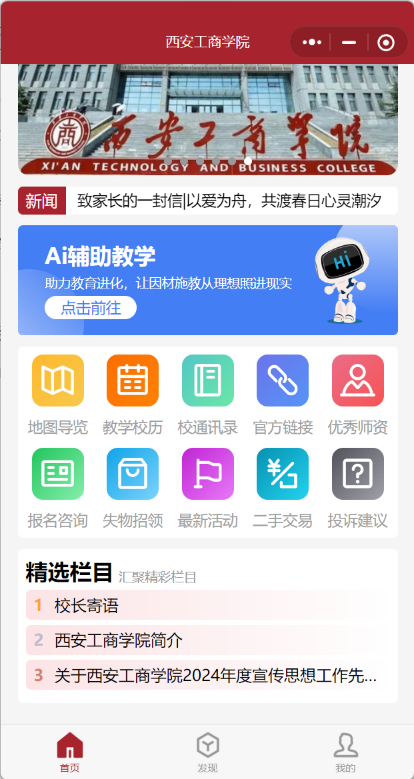 为顺应数字化教育发展趋势,提升校园服务效率与师生体验,西安工商学院倾力打造了集教学、管理、生活服务于一体的移动端智慧平台。本小程序以“便捷、智能、开放”为核心理念,整合校内资源,覆盖AI辅助教学、校园导航、教学校历、新闻公告、发现视频等核心功能,旨在为师生提供一站式校园服务支持。