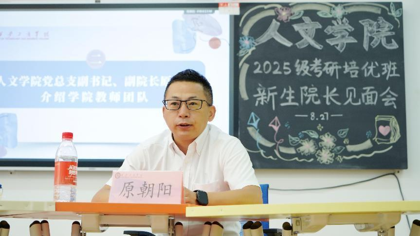 随后,人文学院党总支副书记、副院长原朝阳就学院师资力量与学术资源作了详细介绍,并从“想、做、争、坚持”四个维度勉励同学们积极进行学业与生涯规划,勇于探索、全面发展。