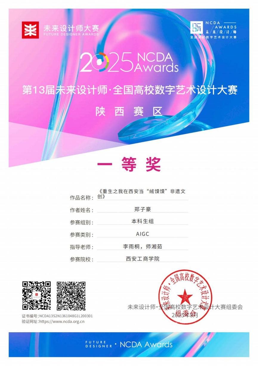近日,第十三届未来设计师·全国高校数字艺术设计大赛(NCDA)陕西赛区获奖名单揭晓。我校人文学院两只队伍斩获佳绩。2022级网络与新媒体专业刘睿团队(周胜玉,雷玉玺)作品与2021级网络与新媒体专业郑子豪团队AIGC赛道的作品双双荣获省级一等奖,李雨桐、师湘茹老师获“优秀指导老师”称号。双一等奖的优异成绩创下我校在该赛事的历史最佳战绩。