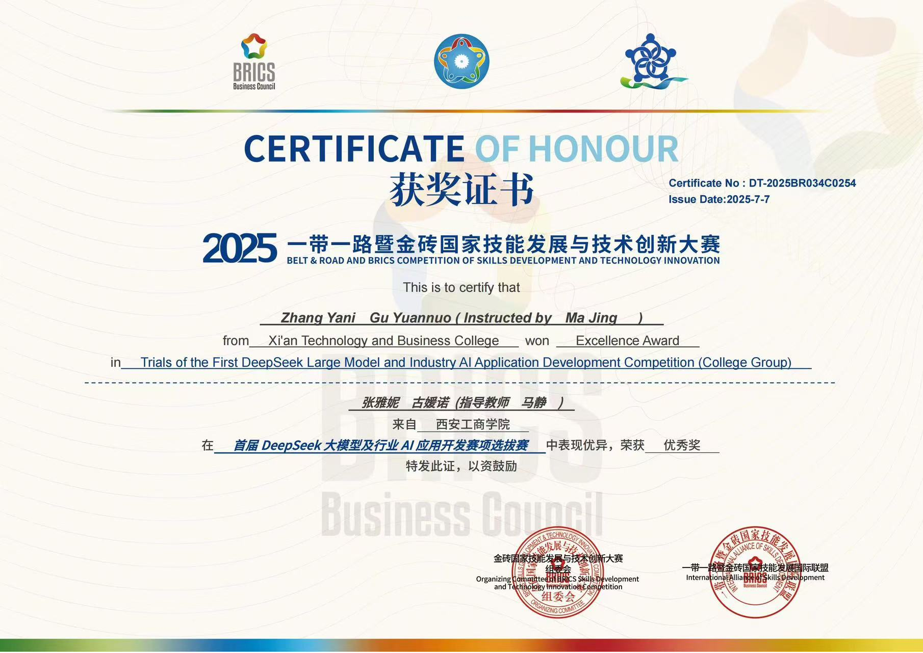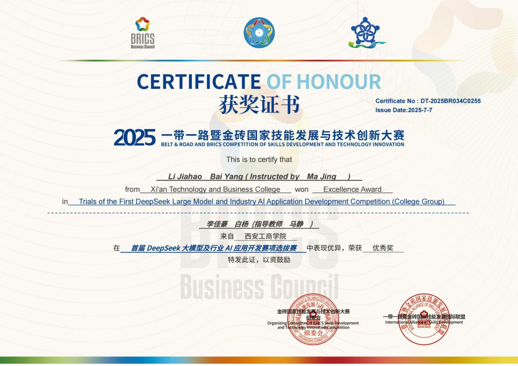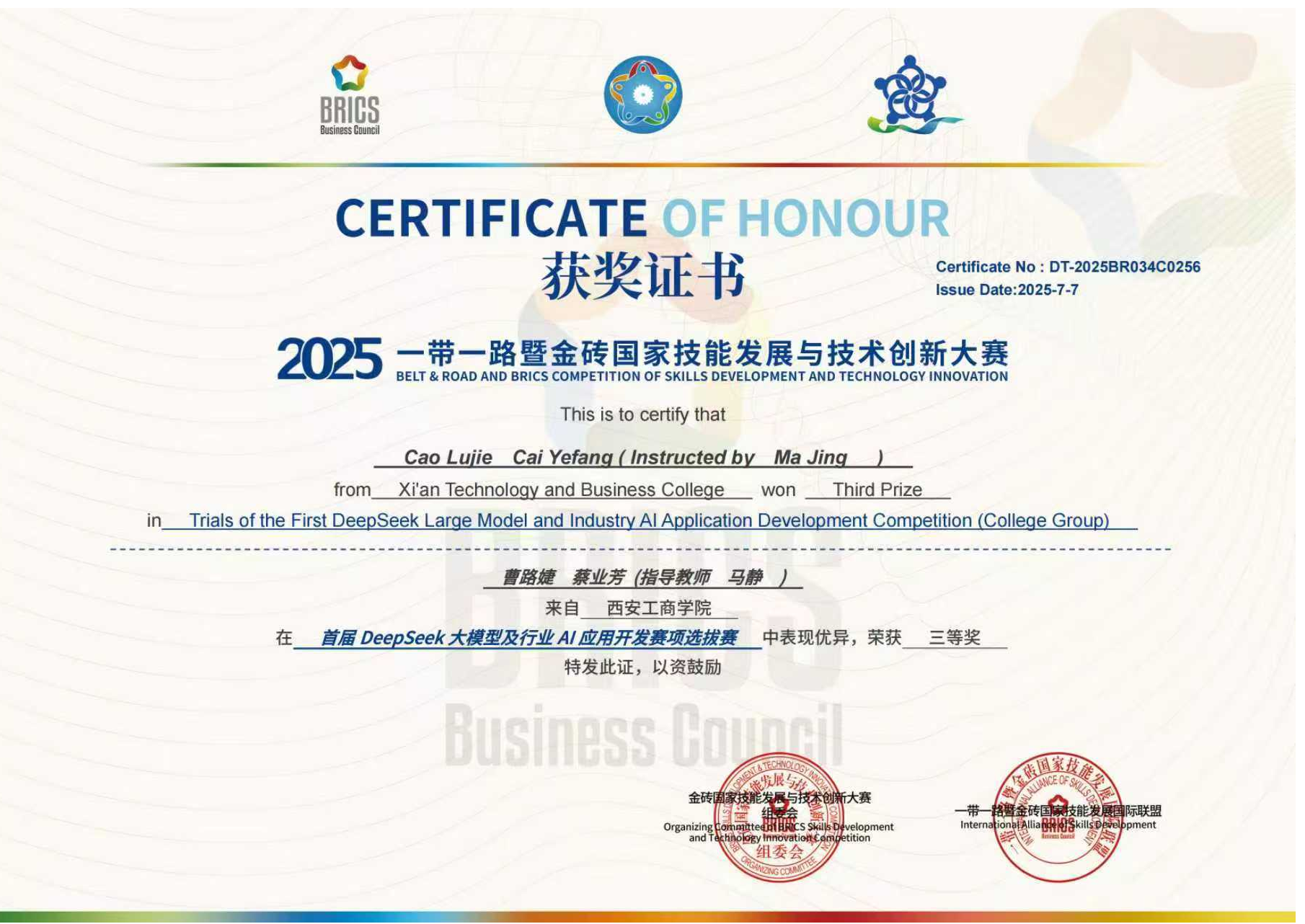 近日,“2025一带一路暨金砖国家技能发展与技术创新大赛”之“首届DeepSeek大模型及行业AI应用开发赛项选拔赛”圆满落幕。西安工商学院信息工程学院(新E代数智未来产业学院)代表队在比赛中表现卓越,凭借扎实的专业能力、充分的赛前准备和出色的临场发挥,共荣获四项优秀奖和一项三等奖,充分展现了我校在人工智能与软件工程教育方面的显著成效和学生的创新实力。